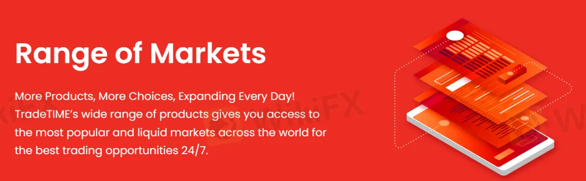 TradeTIMEcung cấp nhiều loại công cụ thị trường, bao gồm ngoại hối, hàng hóa, cổ phiếu, chỉ số và tiền điện tử.