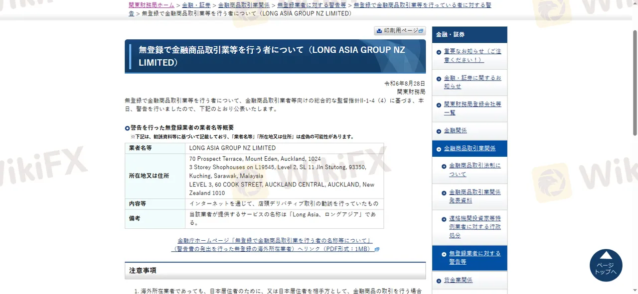 - Cục Tài chính Địa phương Kanto, Nhật Bản (Kanto LFB): Phát hành cảnh báo chống lại Long Asia.