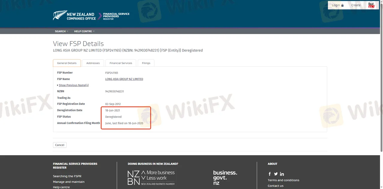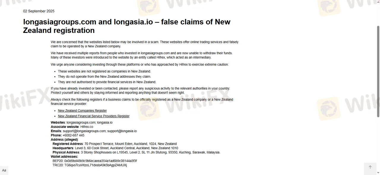 - Cơ quan Thị trường Tài chính New Zealand (NZ FMA): Đưa ra cảnh báo về việc Long Asia và HiFrex đã tuyên bố sai sự thật rằng họ được điều hành bởi một công ty New Zealand.