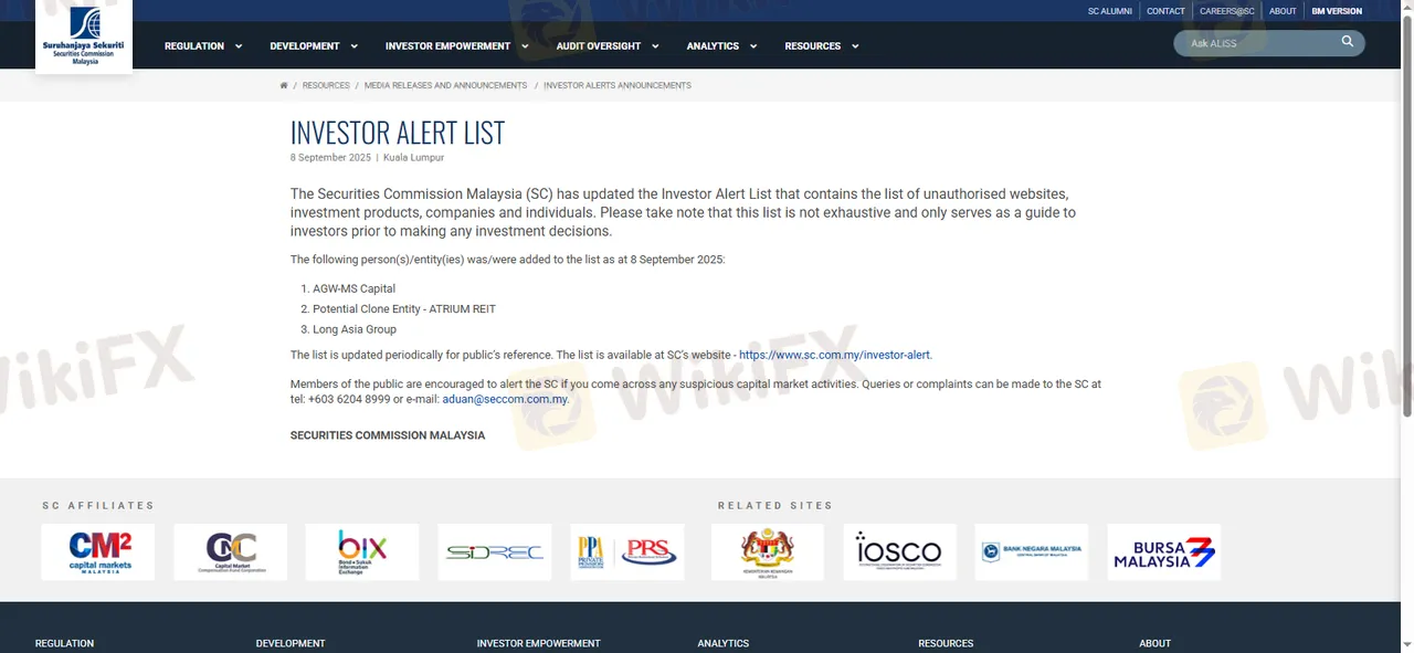 - Ủy ban Chứng khoán Malaysia (SC Malaysia): Đã liệt Long Asia Group vào Danh sách Cảnh báo Nhà đầu tư (Investor Alert List) vì hoạt động trái phép.