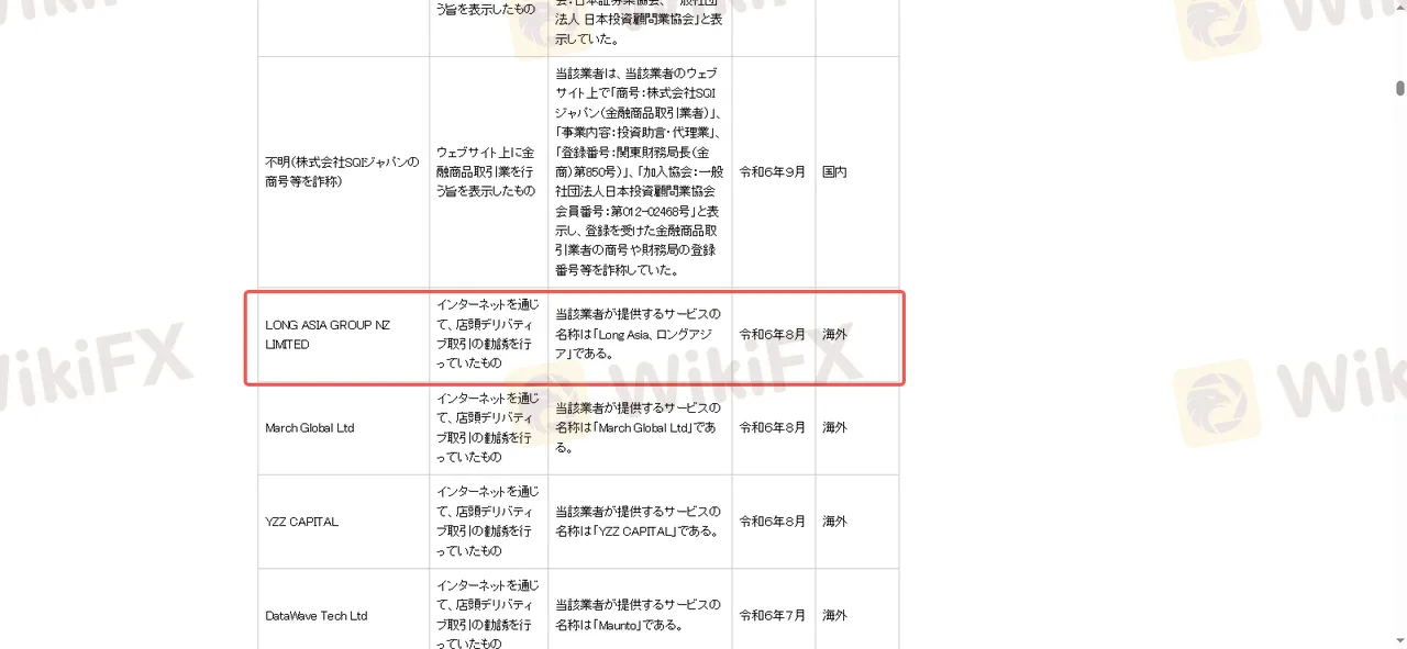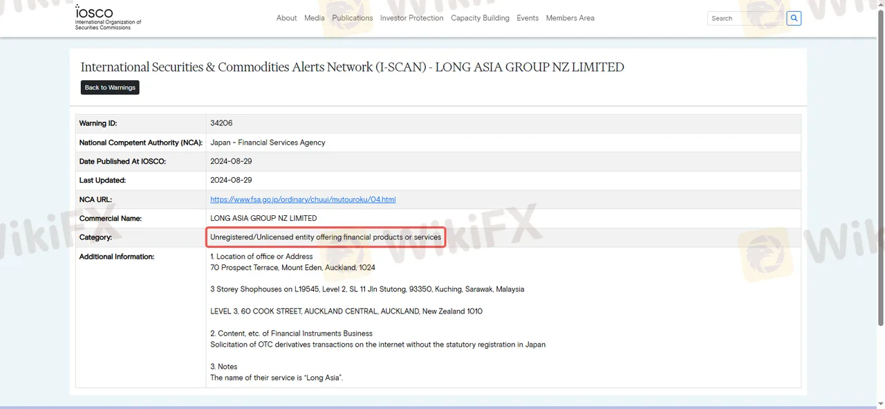 - FSA Nhật Bản và IOSCO: Cảnh báo Long Asia là thực thể “Không đăng ký/Không có giấy phép cung cấp sản phẩm hoặc dịch vụ tài chính”.