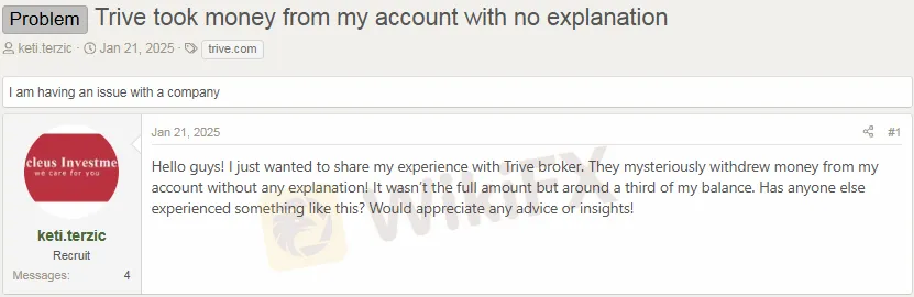 - Một diễn đàn nổi tiếng ghi nhận nhiều tố cáo vào năm 2025 về việc Trive chặn rút tiền một cách vô cớ. Một nhà đầu tư tên Keti Terzic cho biết một khoản tiền lớn đã bị rút khỏi tài khoản mà không có lời giải thích.