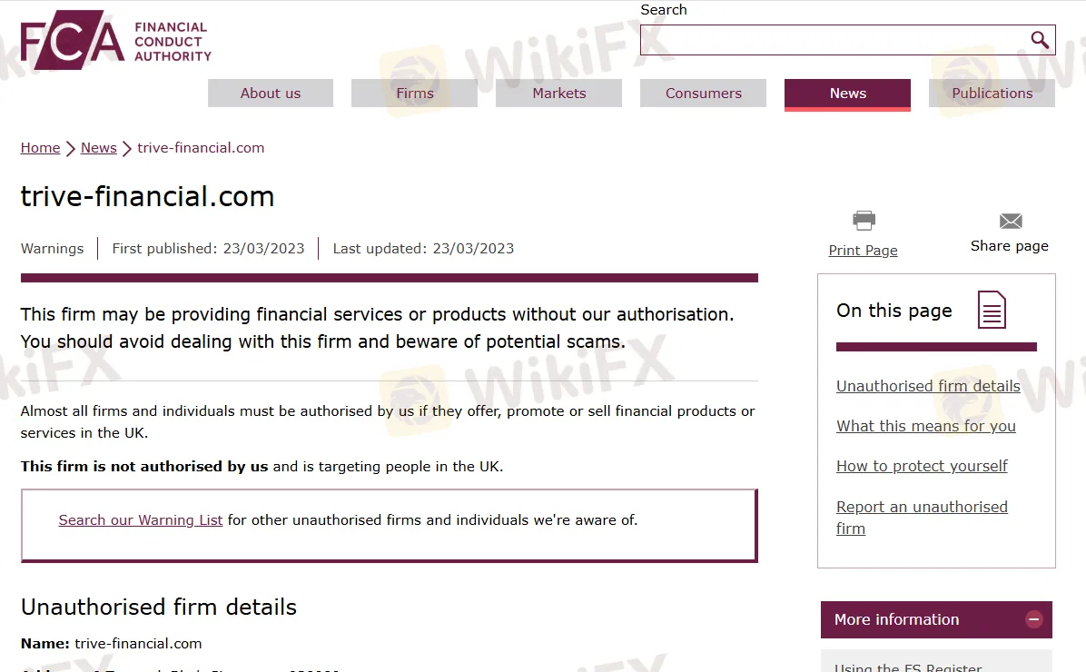 - Cơ quan Quản lý Tài chính Anh (FCA) đã chính thức liệt kê “Trive-Financial.com” vào danh sách các tổ chức hoạt động trái phép. Đây là một cảnh báo cực kỳ nghiêm trọng, đồng nghĩa với việc nhà đầu tư giao dịch tại đây sẽ không được bất kỳ sự bảo vệ nào từ các quỹ bồi thường như FSCS.