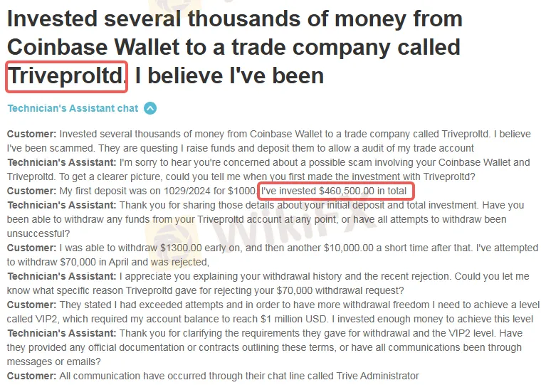 - Trên nền tảng JustAnswer, một nhà đầu tư tố cáo bị lừa bởi Trive Pro Ltd., đầu tư hơn 460.500 USD qua ví Coinbase nhưng chỉ rút được khoản nhỏ ban đầu, sau đó bị yêu cầu nạp thêm để đạt cấp VIP và kiểm toán tài khoản.