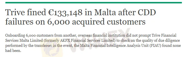 - Tại Malta, Trive đã bị cơ quan quản lý (MFSA) phạt 133,148 Euro vì những sai sót nghiêm trọng trong việc xác minh danh tính của 6,000 khách hàng, một lỗi vi phạm cốt lõi về chống rửa tiền.