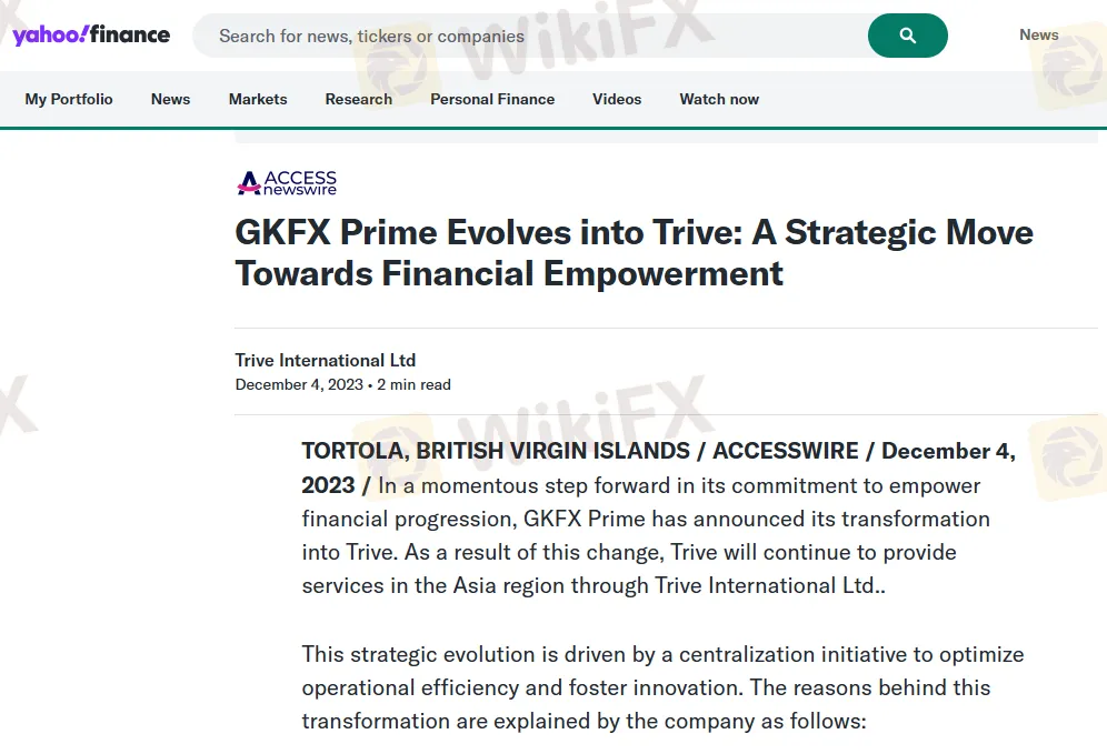 Có lẽ, mảnh ghép quan trọng nhất giúp giải mã mọi nghi vấn nằm ở lịch sử của chính nó: Trive thực chất là sàn GKFX Prime (trước đây là GKFX) sau khi đổi tên vào năm 2023, được xác nhận bởi Yahoo Finance.