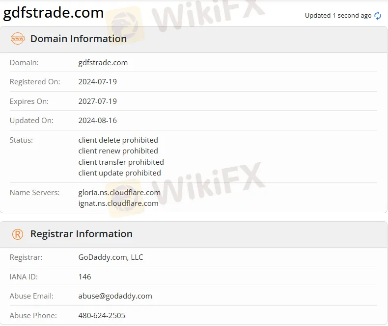 WikiFX ghi nhận tên miền chính của GDFSTRADE (gdfstrade.com) chỉ được đăng ký vào tháng 7/2024, trong khi công ty này tuyên bố đã hoạt động từ năm 2023. Khoảng cách giữa thời điểm thành lập và đăng ký tên miền là một dấu hiệu cảnh báo về sự thiếu minh bạch.