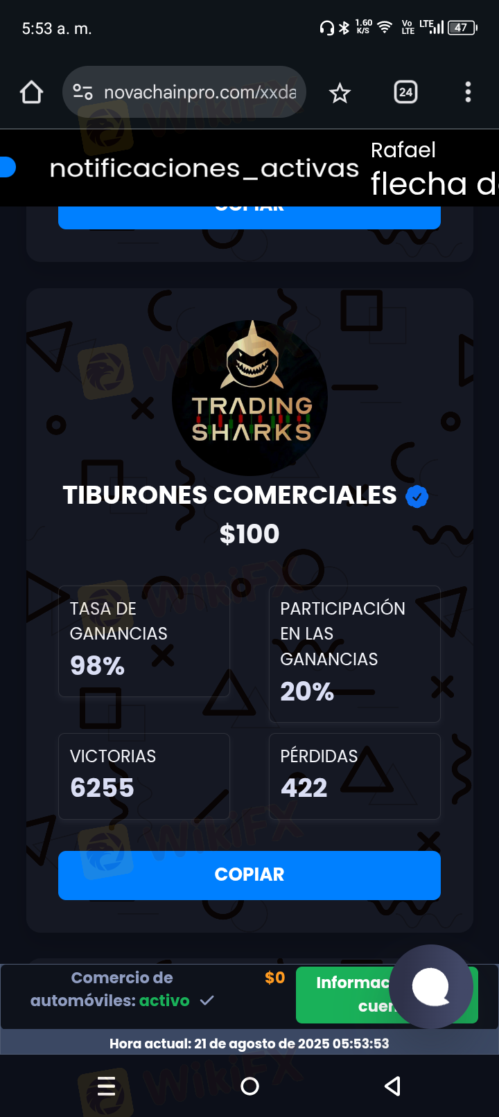 dicen que trabajan con esta persona pero yo personalmente le pregunte a esa persona y me dijo que no, que el no conocía esa página, y que lo más seguro era una estafa, entonces mucho antes ellos me avía dicho que el era muy reconocido en su sitio web por los porcentajes de ganancias, y cuando le dije que mismo le pregunté a esa persona me dijo qué lo más seguro se registró y se salió, pues me dijo 2 cosas diferentes, y ahora le estoy mandando y mandando mensajes al servicio al cliente y al soporte y ninguno responde