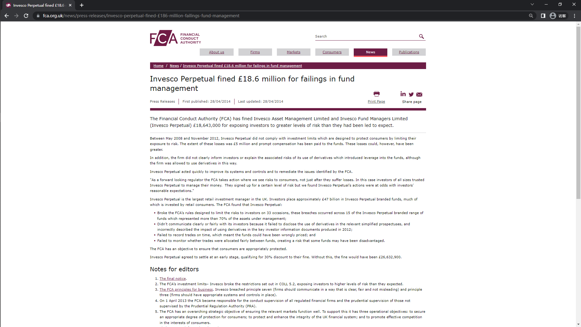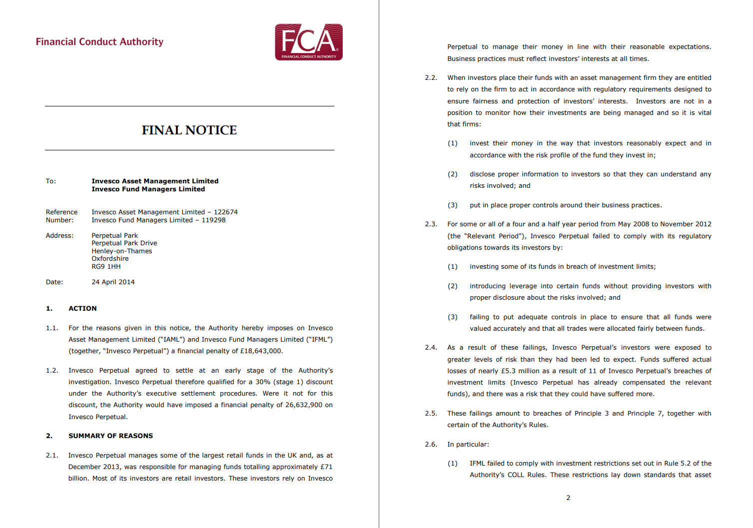 từ tháng 5 năm 2008 đến tháng 11 năm 2012, Invesco vĩnh viễn không tuân thủ các giới hạn đầu tư được thiết kế để bảo vệ người tiêu dùng bằng cách hạn chế rủi ro của họ. mức độ thiệt hại này là 5 triệu bảng Anh và tiền bồi thường nhanh chóng đã được trả cho các quỹ. Tuy nhiên, những tổn thất này có thể lớn hơn. Ngoài ra, công ty đã không thông báo rõ ràng cho các nhà đầu tư hoặc giải thích những rủi ro liên quan khi sử dụng các công cụ phái sinh dẫn đến đòn bẩy vào quỹ, mặc dù công ty được phép sử dụng các công cụ phái sinh theo cách này. Invesco thường xuyên hành động nhanh chóng để cải thiện các hệ thống và kiểm soát của nó và để khắc phục các vấn đề được xác định bởi fca. "với tư cách là một cơ quan quản lý hướng tới tương lai, fca thực hiện hành động khi chúng tôi nhận thấy rủi ro đối với người tiêu dùng, không chỉ sau khi họ bị thua lỗ. trong trường hợp này là các nhà đầu tư thuộc mọi quy mô đáng tin cậy Invesco vĩnh viễn để quản lý tiền của họ. họ đã đăng ký với một mức độ rủi ro nhất định nhưng chúng tôi nhận thấy Invesco Các hành động của vĩnh viễn trái ngược với kỳ vọng hợp lý của các nhà đầu tư. " Invesco vĩnh viễn là nhà quản lý đầu tư bán lẻ lớn nhất ở Anh. các nhà đầu tư đặt khoảng 47 tỷ bảng Anh vào Invesco các quỹ có thương hiệu vĩnh viễn, phần lớn trong số đó được đầu tư bởi người tiêu dùng bán lẻ. fca đã tìm thấy điều đó Invesco vĩnh viễn: đã phá vỡ các quy tắc của fca được thiết kế để hạn chế rủi ro cho các nhà đầu tư trong 33 lần, những vi phạm này đã xảy ra trên 15 Invesco phạm vi quỹ có thương hiệu vĩnh viễn đại diện cho hơn 70% tài sản được quản lý; đã không trao đổi rõ ràng hoặc công bằng với các nhà đầu tư của mình do không tiết lộ việc sử dụng các công cụ phái sinh trong các bản cáo bạch đơn giản hóa có liên quan và mô tả không chính xác tác động của việc sử dụng các công cụ phái sinh trong các tài liệu thông tin về nhà đầu tư quan trọng được tạo ra vào năm 2012; không ghi lại các giao dịch đúng hạn, có nghĩa là tiền có thể đã bị định giá sai; và không theo dõi được liệu các giao dịch có được phân bổ công bằng giữa các quỹ hay không, tạo ra rủi ro rằng một số quỹ có thể bị thiệt thòi. fca có mục tiêu đảm bảo rằng người tiêu dùng được bảo vệ một cách thích hợp. Invesco vĩnh viễn đồng ý giải quyết ở giai đoạn đầu, đủ điều kiện để được giảm 30% tiền phạt của họ. nếu không có điều này, tiền phạt sẽ là £ 26,632,900.