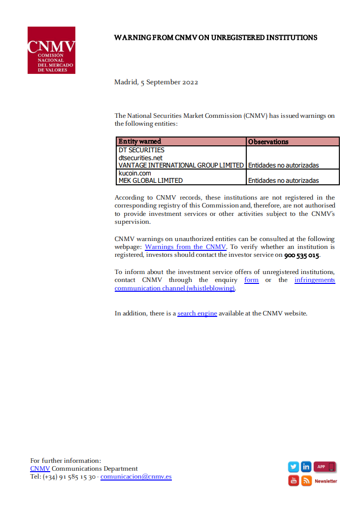 cảnh báo từ cnmv đối với các tổ chức chưa đăng ký madrid, ngày 5 tháng 9 năm 2022 ủy ban thị trường chứng khoán quốc gia (cnmv) đã đưa ra cảnh báo đối với các thực thể sau: thực thể cảnh báo quan sát DT Securities dtsecilities.net vantage international group limited entidades no autorizadas kucoin.com mek global limited entidades no autorizadas theo hồ sơ cnmv, các tổ chức này không được đăng ký trong cơ quan đăng ký tương ứng của ủy ban này và do đó, không được phép cung cấp dịch vụ đầu tư hoặc các hoạt động khác chịu sự giám sát của cnmv. Cảnh báo cnmv về các thực thể trái phép có thể được tham khảo tại trang web sau: cảnh báo từ cnmv. để xác minh xem một tổ chức đã được đăng ký hay chưa, nhà đầu tư nên liên hệ với dịch vụ nhà đầu tư theo số 900 535 015. để thông báo về các ưu đãi dịch vụ đầu tư của các tổ chức chưa đăng ký, liên hệ với cnmv thông qua biểu mẫu yêu cầu hoặc kênh liên lạc vi phạm (tố giác). Ngoài ra, có một công cụ tìm kiếm có sẵn tại trang web cnmv.