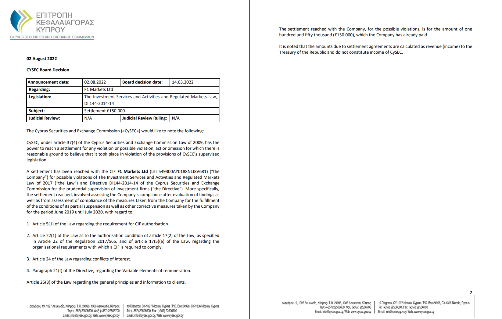 02 tháng 8 năm 2022 Quyết định của Hội đồng quản trị CYSEC Ngày công bố: 02.08.2022 Ngày quyết định của Hội đồng quản trị: 14.03.2022 Về: F1 Markets Ltd Luật pháp: ΤDịch vụ và hoạt động đầu tư và Luật thị trường được điều chỉnh, DI 144-2014-14 Chủ đề: Giải quyết 150.000 € Đánh giá tư pháp: N / A Phán quyết xem xét tư pháp: Không áp dụng Ủy ban Chứng khoán và Giao dịch Síp («CySEC») xin lưu ý những điều sau: CySEC, theo điều 37 (4) của Luật Ủy ban Chứng khoán và Giao dịch Síp năm 2009, có quyền để đạt được giải quyết cho bất kỳ vi phạm hoặc vi phạm có thể xảy ra, hành động hoặc thiếu sót mà có cơ sở hợp lý để tin rằng nó đã diễn ra vi phạm các quy định của luật được giám sát của CySEC. Thỏa thuận đã đạt được với CIF F1 Markets Ltd (LEI 549300AY0188NLJ8V681) (“Công ty”) về các vi phạm có thể xảy ra đối với Hoạt động và Dịch vụ Đầu tư và Luật Thị trường được Điều chỉnh năm 2017 (“Luật”) và Chỉ thị DI144-2014-14 của Ủy ban Chứng khoán và Giao dịch Síp để giám sát thận trọng các công ty đầu tư (“Chỉ thị”). Cụ thể hơn, việc giải quyết đã đạt được, bao gồm việc đánh giá sự tuân thủ của Công ty sau khi đánh giá các phát hiện cũng như từ việc đánh giá sự tuân thủ của các biện pháp được thực hiện từ Công ty đối với việc đáp ứng các điều kiện của việc đình chỉ một phần cũng như các biện pháp khắc phục khác mà Công ty đã thực hiện cho giai đoạn từ tháng 6 năm 2019 đến tháng 7 năm 2020, đối với: 1. Điều 5 (1) của Luật về yêu cầu ủy quyền CIF. 2. Điều 22 (1) của Luật đối với điều kiện ủy quyền của điều 17 (2) của Luật, như được quy định tại Điều 22 của Quy chế 2017/565, và điều 17 (5) (a) của Luật , liên quan đến các yêu cầu tổ chức mà CIF cần phải tuân thủ. 3. Điều 24 của Luật xung đột lợi ích. 4. Đoạn 21 (f) của Chỉ thị, liên quan đến Các yếu tố thay đổi của thù lao. Điều 25 (3) của Luật về các nguyên tắc chung và thông tin cho khách hàng. 2 KT Việc giải quyết với Công ty, đối với các vi phạm có thể xảy ra, là số tiền một trăm năm mươi nghìn (150.000 €) mà Công ty đã thanh toán. Cần lưu ý rằng số tiền do các thỏa thuận thanh toán được tính là doanh thu (thu nhập) cho Kho bạc nước Cộng hòa và không cấu thành thu nhập của CySEC.