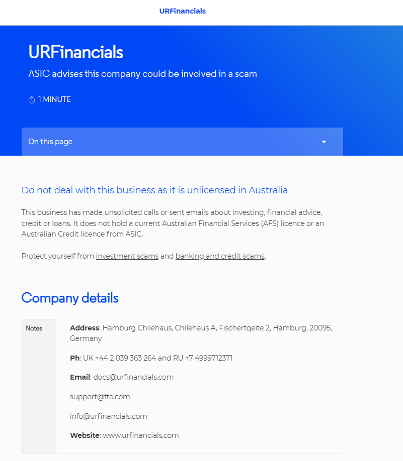 danh sách cảnh báo nhà đầu tư URFinancials ASIC khuyến cáo công ty này có thể liên quan đến lừa đảo.