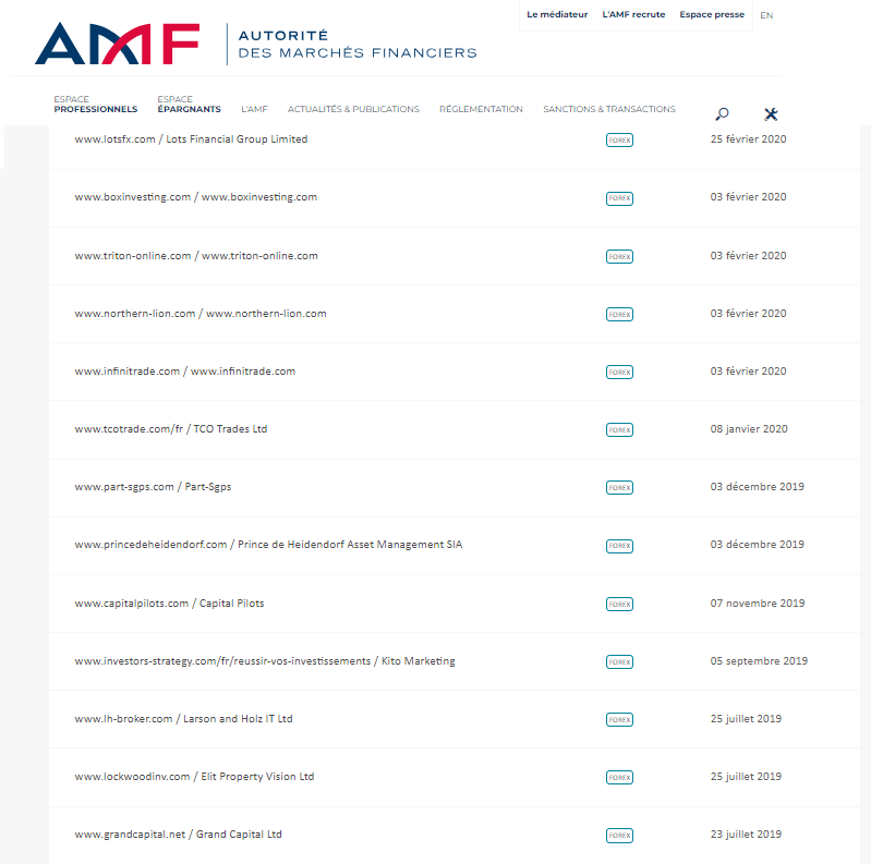 Đây là danh sách các công ty hoặc trang web nằm trong danh sách đen của Autorité des Marchés Financiers (AMF), cảnh báo và/hoặc chiếm đoạt của các công ty được quản lý.