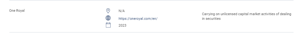 "phần này chứa danh sách các trang web, sản phẩm đầu tư, công ty và cá nhân trái phép. danh sách này bao gồm: những người thực hiện hoặc tự mình thực hiện các hoạt động được quy định sau đây mà không có giấy phép từ sc: kinh doanh chứng khoán; kinh doanh các công cụ phái sinh; quản lý quỹ; tư vấn về tài chính doanh nghiệp; tư vấn đầu tư; lập kế hoạch tài chính; và kinh doanh các chương trình hưu trí tư nhân. người điều hành một thị trường được công nhận mà không được phép. " một hoàng gia không có https:// OneRoyal .com/en/ 2023 thực hiện các hoạt động mua bán chứng khoán trên thị trường vốn không được cấp phép