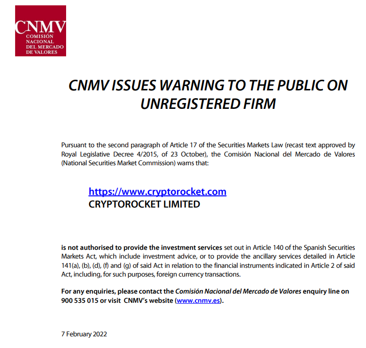 CryptoRocket Limited(https://www. CryptoRocket .com) 02/09/2022 Tây Ban Nha cnmv đưa ra cảnh báo cho công chúng về công ty chưa đăng ký theo đoạn thứ hai điều 17 của luật thị trường chứng khoán (văn bản viết lại được phê duyệt bởi nghị định lập pháp hoàng gia ngày 23 tháng 10 năm 2015), ủy ban nacional del mercado de valores (ủy ban thị trường chứng khoán quốc gia) cảnh báo rằng: CryptoRocket Limited không được phép cung cấp các dịch vụ đầu tư quy định tại điều 140 của đạo luật thị trường chứng khoán Tây Ban Nha, bao gồm tư vấn đầu tư hoặc cung cấp các dịch vụ phụ trợ được nêu chi tiết tại điều 141(a), (b), (d), (f) và (g) của đạo luật nói trên liên quan đến các công cụ tài chính nêu tại điều 2 của đạo luật nói trên, bao gồm, vì những mục đích đó, các giao dịch ngoại tệ. nếu có bất kỳ thắc mắc nào, vui lòng liên hệ với đường dây yêu cầu của comisión nacional del mercado de valores theo số 900 535 015 hoặc truy cập trang web của cnmv (www.cnmv.es). 7 tháng 2 năm 2022