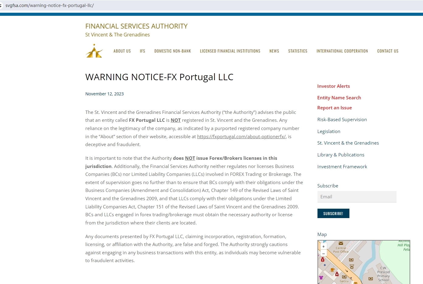 đường phố Vincent và cơ quan dịch vụ tài chính Grenadines (“cơ quan”) thông báo cho công chúng rằng một thực thể được gọi là Fx Portugal LLC chưa được đăng ký ở st. Vincent và Grenadines. bất kỳ sự tin cậy nào vào tính hợp pháp của công ty, như được biểu thị bằng số công ty đã đăng ký có mục đích trong phần “giới thiệu” trên trang web của họ, có thể truy cập tại https://fxportugal.com/about-optionerfx/, đều là lừa đảo và gian lận. điều quan trọng cần lưu ý là cơ quan có thẩm quyền không cấp giấy phép ngoại hối/môi giới trong khu vực pháp lý này. Ngoài ra, cơ quan dịch vụ tài chính không quản lý hay cấp phép cho các công ty kinh doanh (bcs) cũng như công ty trách nhiệm hữu hạn (llcs) tham gia vào giao dịch hoặc môi giới ngoại hối. phạm vi giám sát không đi xa hơn việc đảm bảo rằng các BCs tuân thủ các nghĩa vụ của họ theo đạo luật công ty kinh doanh (sửa đổi và hợp nhất), chương 149 của luật sửa đổi của Saint Vincent và Grenadines 2009, và các LLC tuân thủ các nghĩa vụ của họ theo Đạo luật này. Đạo luật công ty trách nhiệm hữu hạn, chương 151 của luật sửa đổi Saint Vincent và Grenadines năm 2009. BCS và LLC tham gia giao dịch/môi giới ngoại hối phải có thẩm quyền hoặc giấy phép cần thiết từ khu vực pháp lý nơi khách hàng của họ sinh sống. bất kỳ tài liệu nào được trình bày bởi Fx Portugal LLC , tuyên bố việc thành lập, đăng ký, thành lập, cấp phép hoặc liên kết với cơ quan có thẩm quyền là sai và giả mạo. cơ quan có thẩm quyền hết sức cảnh báo không nên tham gia vào bất kỳ giao dịch kinh doanh nào với tổ chức này vì các cá nhân có thể dễ bị thực hiện các hoạt động lừa đảo.