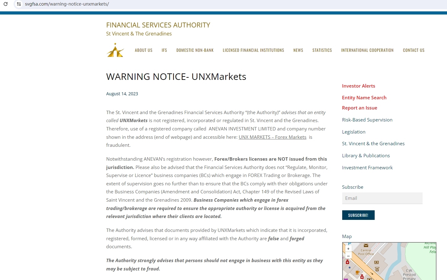 đường phố vincent và cơ quan dịch vụ tài chính Grenadines “(cơ quan có thẩm quyền)” khuyến cáo rằng một thực thể được gọi là unxmarkets chưa được đăng ký, thành lập hoặc quản lý tại st. Vincent và Grenadines. do đó, việc sử dụng một công ty đã đăng ký có tên là ANEVAN INVESTMENT LIMITED và số công ty hiển thị trong địa chỉ (cuối trang web) và có thể truy cập tại đây: UNX Markets – thị trường ngoại hối là lừa đảo. tuy nhiên, bất chấp việc đăng ký của anevan, giấy phép môi giới/ngoại hối không được cấp từ khu vực pháp lý này. Cũng xin lưu ý rằng cơ quan dịch vụ tài chính không “quản lý, giám sát, giám sát hoặc cấp phép” cho các công ty kinh doanh (bcs) tham gia giao dịch hoặc môi giới ngoại hối. phạm vi giám sát không đi xa hơn việc đảm bảo rằng các BCs tuân thủ nghĩa vụ của họ theo đạo luật công ty kinh doanh (sửa đổi và hợp nhất), chương 149 của luật sửa đổi của Saint Vincent và Grenadines năm 2009. các công ty kinh doanh tham gia giao dịch ngoại hối/ môi giới được yêu cầu đảm bảo có được thẩm quyền hoặc giấy phép phù hợp từ khu vực pháp lý có liên quan nơi khách hàng của họ sinh sống. Cơ quan này khuyến cáo rằng các tài liệu do unxmarkets cung cấp cho thấy rằng tổ chức này được thành lập, đăng ký, thành lập, cấp phép hoặc có liên kết với cơ quan có thẩm quyền theo bất kỳ cách nào đều là tài liệu sai và giả mạo. cơ quan có thẩm quyền khuyến cáo mạnh mẽ rằng mọi người không nên tham gia kinh doanh với tổ chức này vì họ có thể bị lừa đảo.