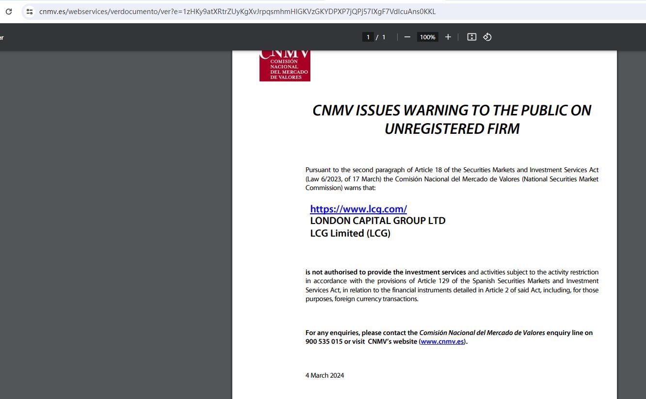 cnmv đưa ra cảnh báo cho công chúng về công ty chưa đăng ký theo đoạn thứ hai điều 18 của đạo luật thị trường chứng khoán và dịch vụ đầu tư (luật 6/2023, ngày 17 tháng 3) comisión nacional del mercado de valores (ủy ban thị trường chứng khoán quốc gia) cảnh báo rằng : https://www. LCG .com/ London Capital Group Ltd LCG giới hạn ( LCG ) không được phép cung cấp các dịch vụ đầu tư và các hoạt động bị hạn chế hoạt động theo quy định tại điều 129 của đạo luật về thị trường chứng khoán và dịch vụ đầu tư của Tây Ban Nha, liên quan đến các công cụ tài chính được nêu chi tiết tại điều 2 của đạo luật nói trên, bao gồm, cho những mục đích đó, các giao dịch ngoại tệ. nếu có bất kỳ thắc mắc nào, vui lòng liên hệ với đường dây yêu cầu của comisión nacional del mercado de valores theo số 900 535 015 hoặc truy cập trang web của cnmv (www.cnmv.es). 4 tháng 3 năm 2024 .