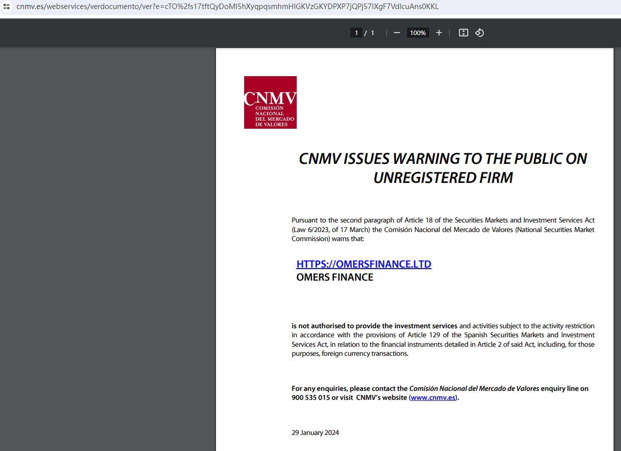 cnmv đưa ra cảnh báo cho công chúng về công ty chưa đăng ký theo đoạn thứ hai điều 18 của đạo luật thị trường chứng khoán và dịch vụ đầu tư (luật 6/2023, ngày 17 tháng 3) comisión nacional del mercado de valores (ủy ban thị trường chứng khoán quốc gia) cảnh báo rằng : https://omersfinance.ltd Omers Finance không được phép cung cấp các dịch vụ đầu tư và các hoạt động bị hạn chế hoạt động theo quy định tại Điều 129 của Đạo luật thị trường chứng khoán và dịch vụ đầu tư của Tây Ban Nha, liên quan đến các công cụ tài chính được nêu chi tiết tại Điều 2 của đạo luật nói trên, bao gồm, đối với các mục đích đó, giao dịch ngoại tệ. nếu có bất kỳ thắc mắc nào, vui lòng liên hệ với đường dây yêu cầu của comisión nacional del mercado de valores theo số 900 535 015 hoặc truy cập trang web của cnmv (www.cnmv.es). 29 tháng 1 năm 2024