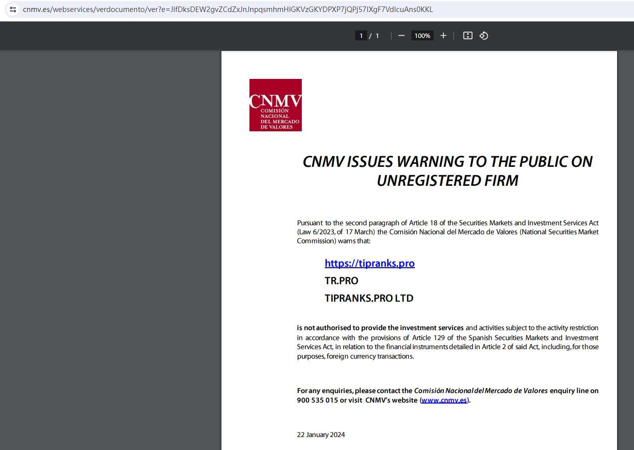 • Lý do bị phạt https:// Tipranks.pro tr.pro Tipranks.pro ltd không được phép cung cấp các dịch vụ đầu tư và các hoạt động bị hạn chế hoạt động theo quy định tại điều 129 của Đạo luật thị trường chứng khoán và dịch vụ đầu tư Tây Ban Nha