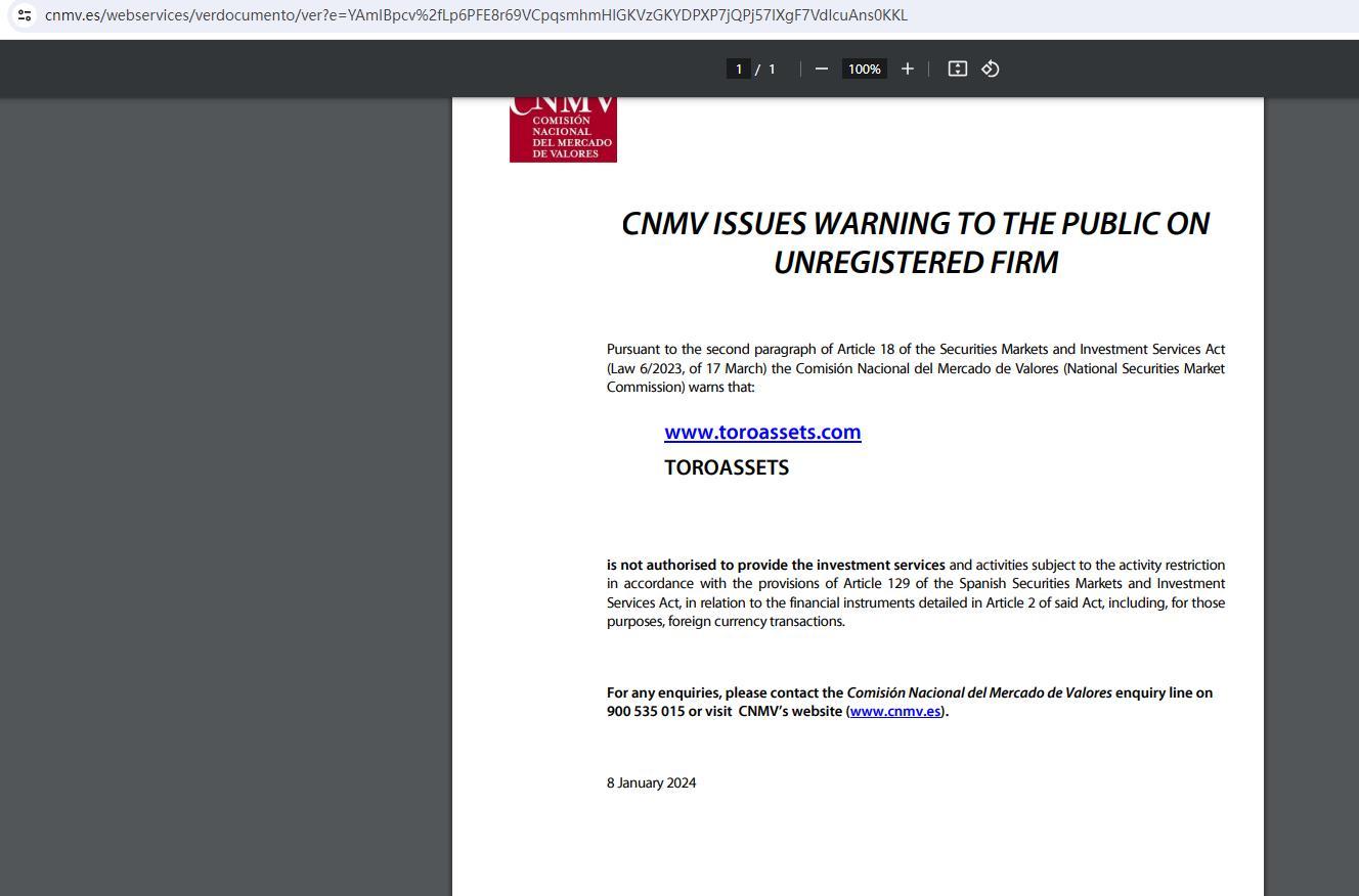cnmv đưa ra cảnh báo cho công chúng về công ty chưa đăng ký theo đoạn thứ hai điều 18 của đạo luật thị trường chứng khoán và dịch vụ đầu tư (luật 6/2023, ngày 17 tháng 3) comisión nacional del mercado de valores (ủy ban thị trường chứng khoán quốc gia) cảnh báo rằng : www. ToroAssets .com ToroAssets không được phép cung cấp các dịch vụ đầu tư và các hoạt động bị hạn chế hoạt động theo quy định tại Điều 129 của Đạo luật về thị trường chứng khoán và dịch vụ đầu tư của Tây Ban Nha, liên quan đến các công cụ tài chính được nêu chi tiết tại Điều 2 của đạo luật nói trên, bao gồm, đối với các mục đích đó, giao dịch ngoại tệ. nếu có bất kỳ thắc mắc nào, vui lòng liên hệ với đường dây yêu cầu của comisión nacional del mercado de valores theo số 900 535 015 hoặc truy cập trang web của cnmv (www.cnmv.es). 8 tháng 1 năm 2024