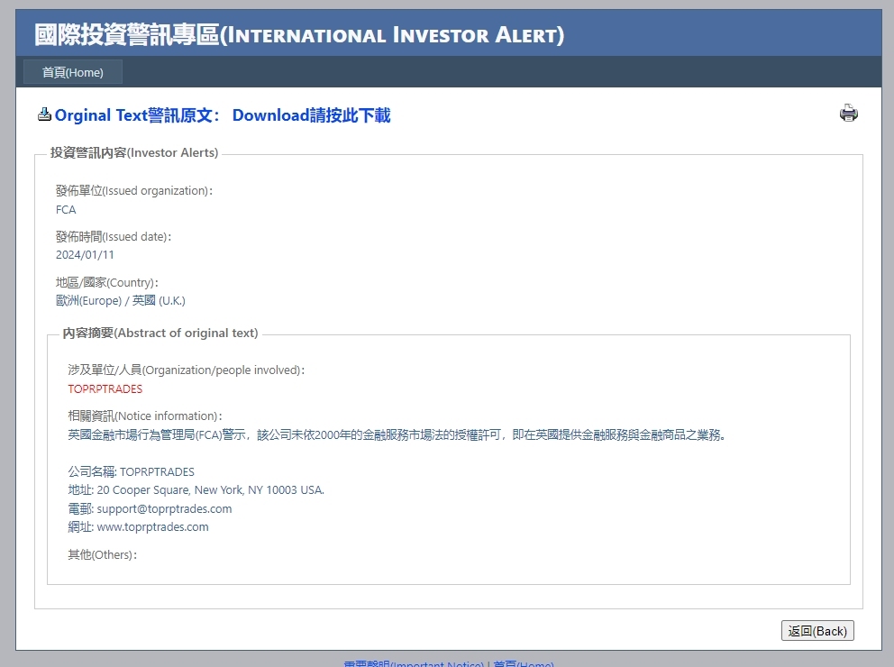 TOPRPTRADEScảnh báo được xuất bản lần đầu: 01/11/2024 cập nhật lần cuối: 01/11/2024 f gần như tất cả các công ty và cá nhân phải được chúng tôi ủy quyền để thực hiện hoặc quảng bá các dịch vụ tài chính ở Vương quốc Anh. công ty này không được chúng tôi ủy quyền và có thể nhắm mục tiêu đến những người ở Vương quốc Anh. tìm kiếm danh sách cảnh báo của chúng tôi để tìm các công ty và cá nhân trái phép khác mà chúng tôi biết. tên chi tiết công ty trái phép: TOPRPTRADES Địa chỉ: 20 Cooper Square, New York, NY 10003 Hoa Kỳ. hỗ trợ email@ TOPRPTRADES Trang web .com: www. TOPRPTRADES .com một số công ty có thể cung cấp thông tin liên hệ không chính xác bao gồm địa chỉ gửi thư, số điện thoại và địa chỉ email. họ có thể thay đổi những chi tiết liên lạc này theo thời gian. họ cũng có thể cung cấp cho bạn thông tin chi tiết thuộc về doanh nghiệp hoặc cá nhân khác để thông tin có vẻ xác thực. điều này có ý nghĩa gì đối với bạn nếu bạn giao dịch với công ty này, bạn sẽ không có quyền truy cập vào dịch vụ thanh tra tài chính nếu bạn có khiếu nại. bạn cũng sẽ không được bảo vệ bởi chương trình bồi thường dịch vụ tài chính (fscs) nếu có sự cố xảy ra. điều này có nghĩa là bạn khó có thể lấy lại được tiền nếu công ty phá sản. cách tự bảo vệ mình, bạn chỉ nên giao dịch với các công ty tài chính được chúng tôi ủy quyền. nếu một công ty tài chính được chúng tôi ủy quyền, nó sẽ mang lại cho bạn sự bảo vệ tốt hơn nếu có sự cố xảy ra. bạn có thể kiểm tra sổ đăng ký dịch vụ tài chính của chúng tôi để đảm bảo rằng một công ty được ủy quyền và được phép sử dụng dịch vụ mà công ty đó cung cấp cho bạn. bạn cũng có thể tìm thấy: • thông tin về cách bạn được bảo vệ • chi tiết liên hệ của các công ty được ủy quyền nếu một doanh nghiệp hoặc cá nhân tài chính bất ngờ liên hệ với bạn, hãy đảm bảo bạn trả lời bằng cách sử dụng chi tiết liên hệ trên sổ đăng ký fs. tìm hiểu thêm về cách bảo vệ bản thân khỏi lừa đảo. báo cáo một công ty trái phép nếu bạn cho rằng mình đã được một công ty trái phép tiếp cận, hãy gọi cho chúng tôi theo số 0800 111 6768 hoặc sử dụng biểu mẫu liên hệ của chúng tôi.