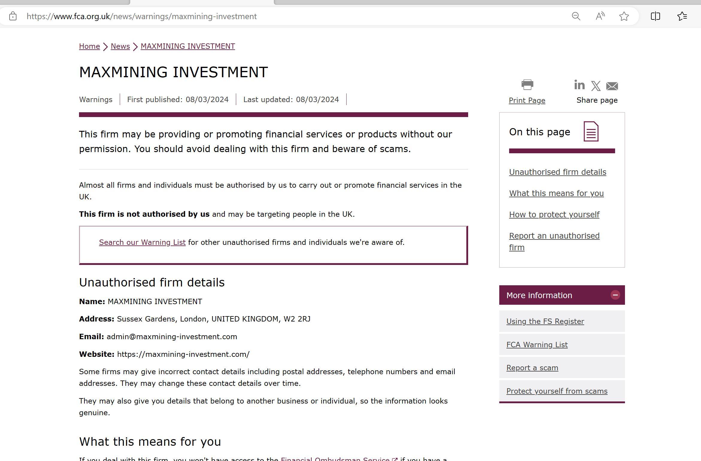 Danh sách cảnh báo FCA về các công ty không được ủy quyền MAXMINING INVESTMENT.