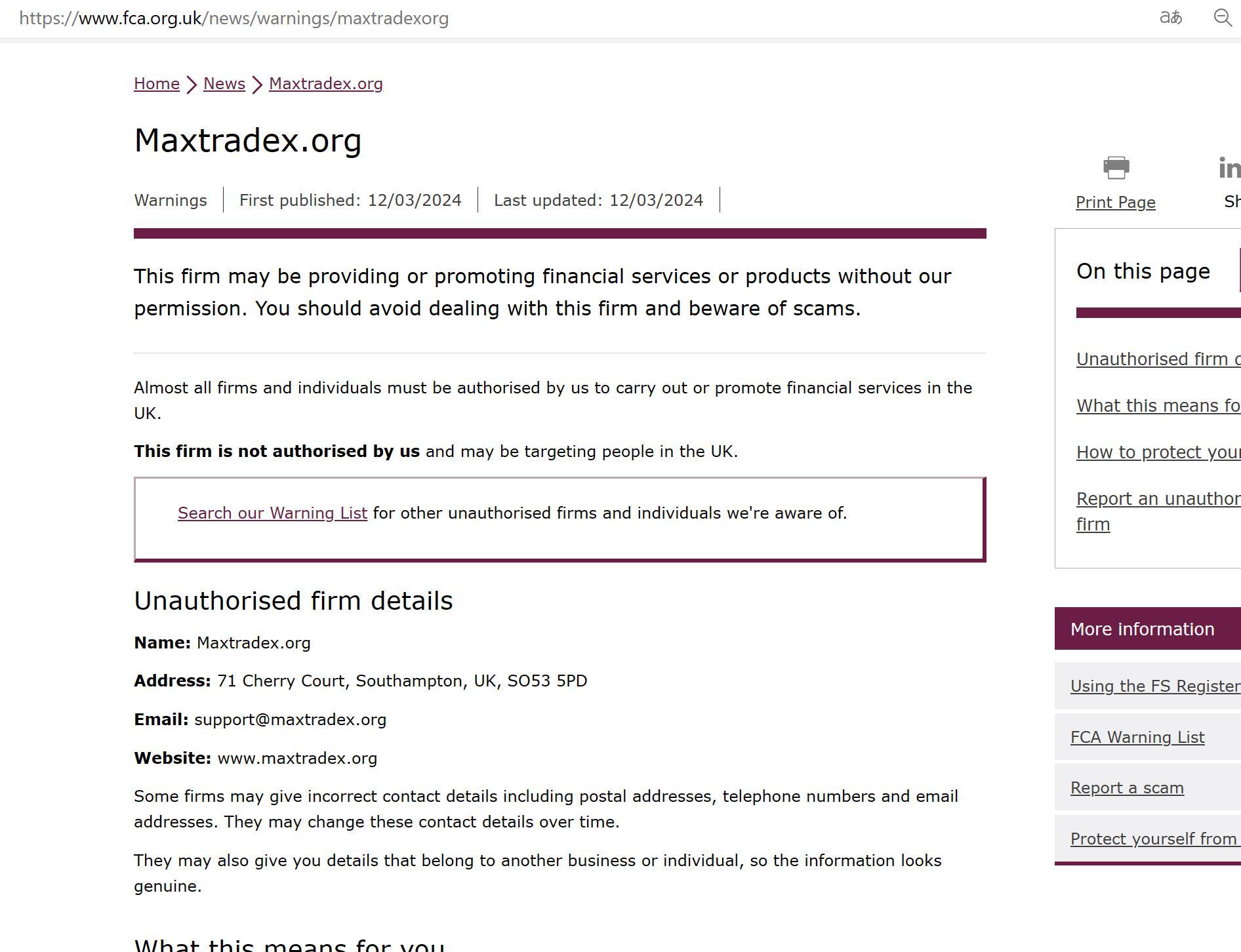 Danh sách cảnh báo FCA về các công ty không được ủy quyền Maxtradex.org.