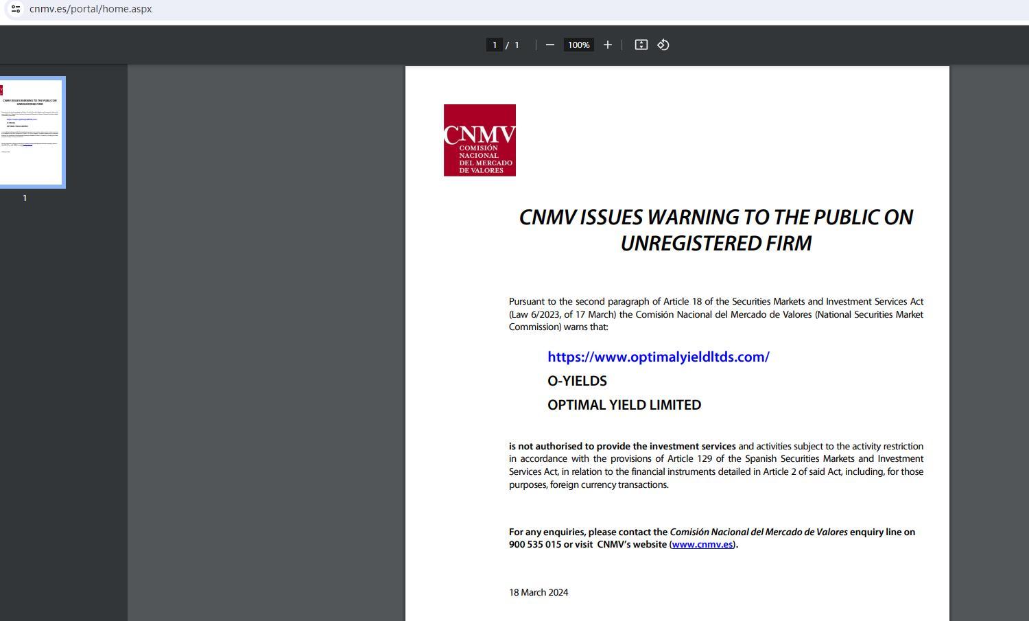 cnmv đưa ra cảnh báo cho công chúng về công ty chưa đăng ký theo đoạn thứ hai điều 18 của đạo luật thị trường chứng khoán và dịch vụ đầu tư (luật 6/2023, ngày 17 tháng 3) comisión nacional del mercado de valores (ủy ban thị trường chứng khoán quốc gia) cảnh báo rằng : https://www.optimalyieldltds.com/ o-yields Optimal Yield Limited không được phép cung cấp các dịch vụ đầu tư và các hoạt động bị hạn chế hoạt động theo quy định tại Điều 129 của Đạo luật thị trường chứng khoán và dịch vụ đầu tư Tây Ban Nha, liên quan đến các công cụ tài chính được nêu chi tiết tại Điều 2 của đạo luật nói trên, bao gồm, đối với các mục đích đó, giao dịch ngoại tệ. nếu có bất kỳ thắc mắc nào, vui lòng liên hệ với đường dây yêu cầu của comisión nacional del mercado de valores theo số 900 535 015 hoặc truy cập trang web của cnmv (www.cnmv.es). 18 tháng 3 năm 2024