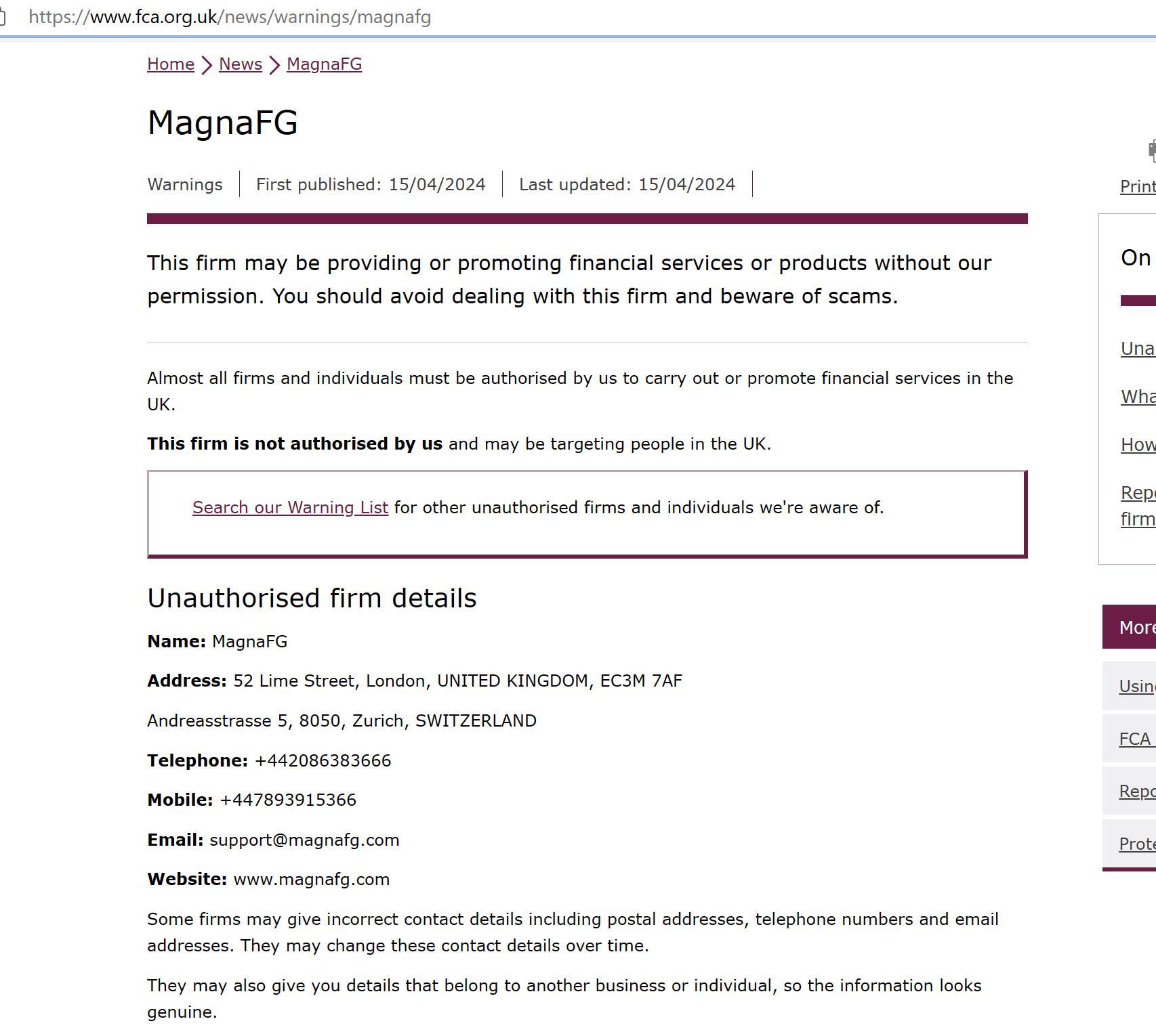 xuất bản lần đầu: 04/15/2024 cập nhật lần cuối: 15/04/2024 công ty này có thể đang cung cấp hoặc quảng bá các sản phẩm hoặc dịch vụ tài chính mà không có sự cho phép của chúng tôi. bạn nên tránh giao dịch với công ty này và hãy cẩn thận với những trò gian lận. hầu hết tất cả các công ty và cá nhân phải được chúng tôi ủy quyền để thực hiện hoặc quảng bá các dịch vụ tài chính ở Vương quốc Anh. công ty này không được chúng tôi ủy quyền và có thể nhắm mục tiêu đến những người ở Vương quốc Anh. tìm kiếm danh sách cảnh báo của chúng tôi để tìm các công ty và cá nhân trái phép khác mà chúng tôi biết. tên chi tiết công ty trái phép: MAGNAFG địa chỉ: 52 Lime Street, London, United Kingdom, ec3m 7af andreasstrasse 5, 8050, Zurich, Switzerland Điện thoại: +442086383666 di động: +447893915366 email: support@ MAGNAFG Trang web .com: www. MAGNAFG .com một số công ty có thể cung cấp thông tin liên hệ không chính xác bao gồm địa chỉ gửi thư, số điện thoại và địa chỉ email. họ có thể thay đổi những chi tiết liên lạc này theo thời gian. họ cũng có thể cung cấp cho bạn thông tin chi tiết thuộc về doanh nghiệp hoặc cá nhân khác để thông tin có vẻ xác thực.