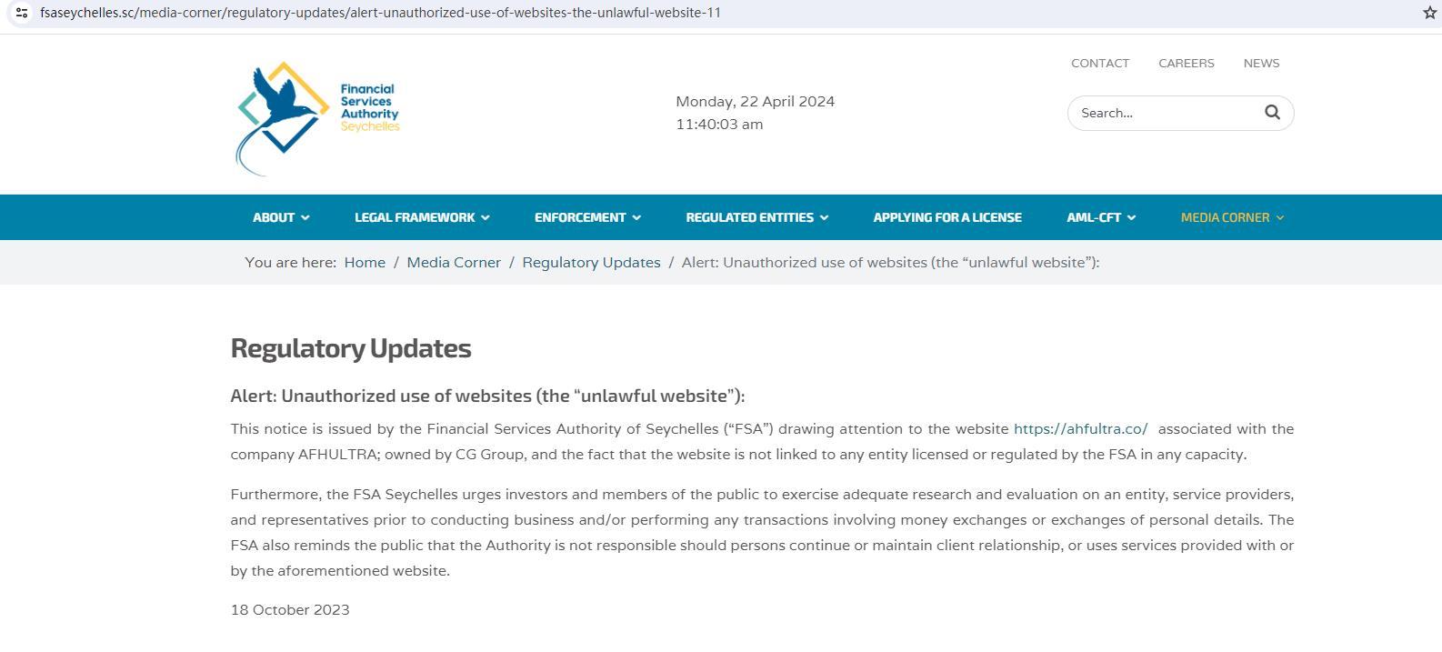 Cảnh báo cập nhật quy định: Việc sử dụng trái phép các trang web (“trang web bất hợp pháp”): Thông báo này được đưa ra bởi Cơ quan Dịch vụ Tài chính Seychelles (“FSA”) thu hút sự chú ý đến trang web https://ahfultra.co/ được liên kết với công ty AFHULTRA ; thuộc sở hữu của CG Group và thực tế là trang web này không được liên kết với bất kỳ tổ chức nào được FSA cấp phép hoặc quản lý dưới bất kỳ hình thức nào. Hơn nữa, FSA Seychelles kêu gọi các nhà đầu tư và công chúng thực hiện nghiên cứu và đánh giá đầy đủ về một thực thể, nhà cung cấp dịch vụ và người đại diện trước khi tiến hành kinh doanh và/hoặc thực hiện bất kỳ giao dịch nào liên quan đến đổi tiền hoặc trao đổi thông tin cá nhân. FSA cũng nhắc nhở công chúng rằng Cơ quan này không chịu trách nhiệm nếu mọi người tiếp tục hoặc duy trì mối quan hệ với khách hàng hoặc sử dụng các dịch vụ được cung cấp bởi hoặc bởi trang web nói trên. 18 tháng 10 năm 2023