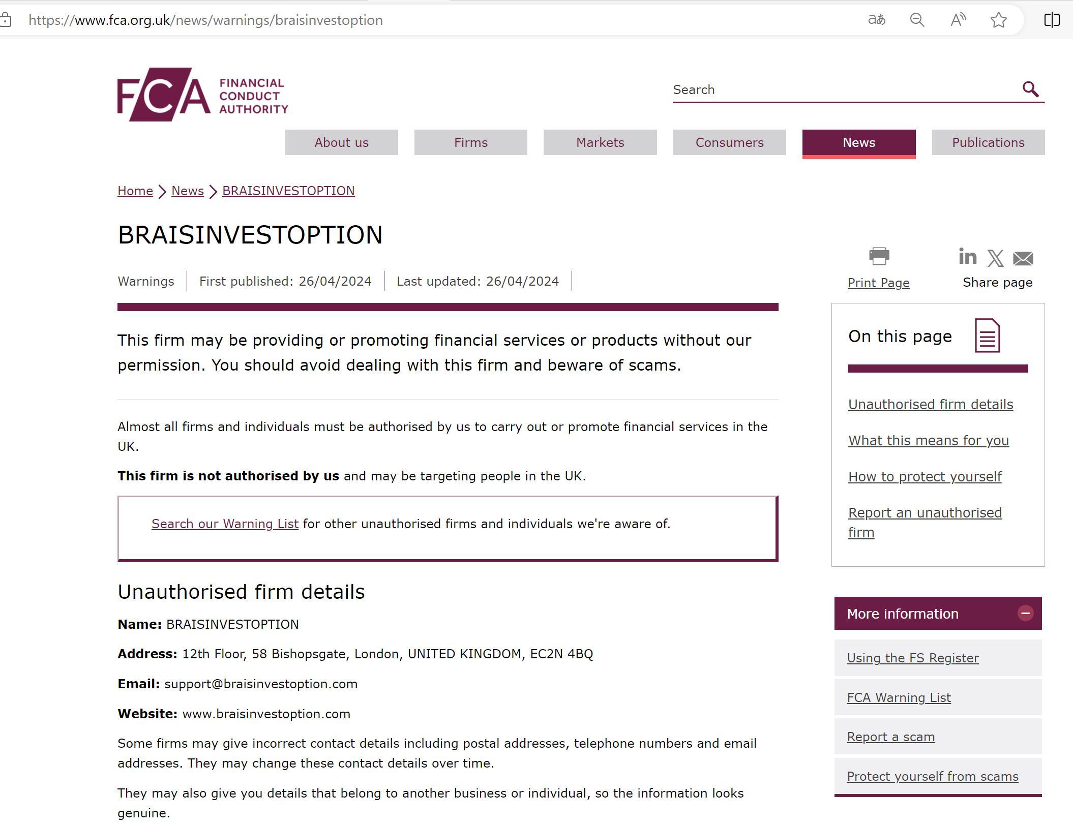 Danh sách cảnh báo FCA về các công ty không được ủy quyền BRAISINVESTOPTION.