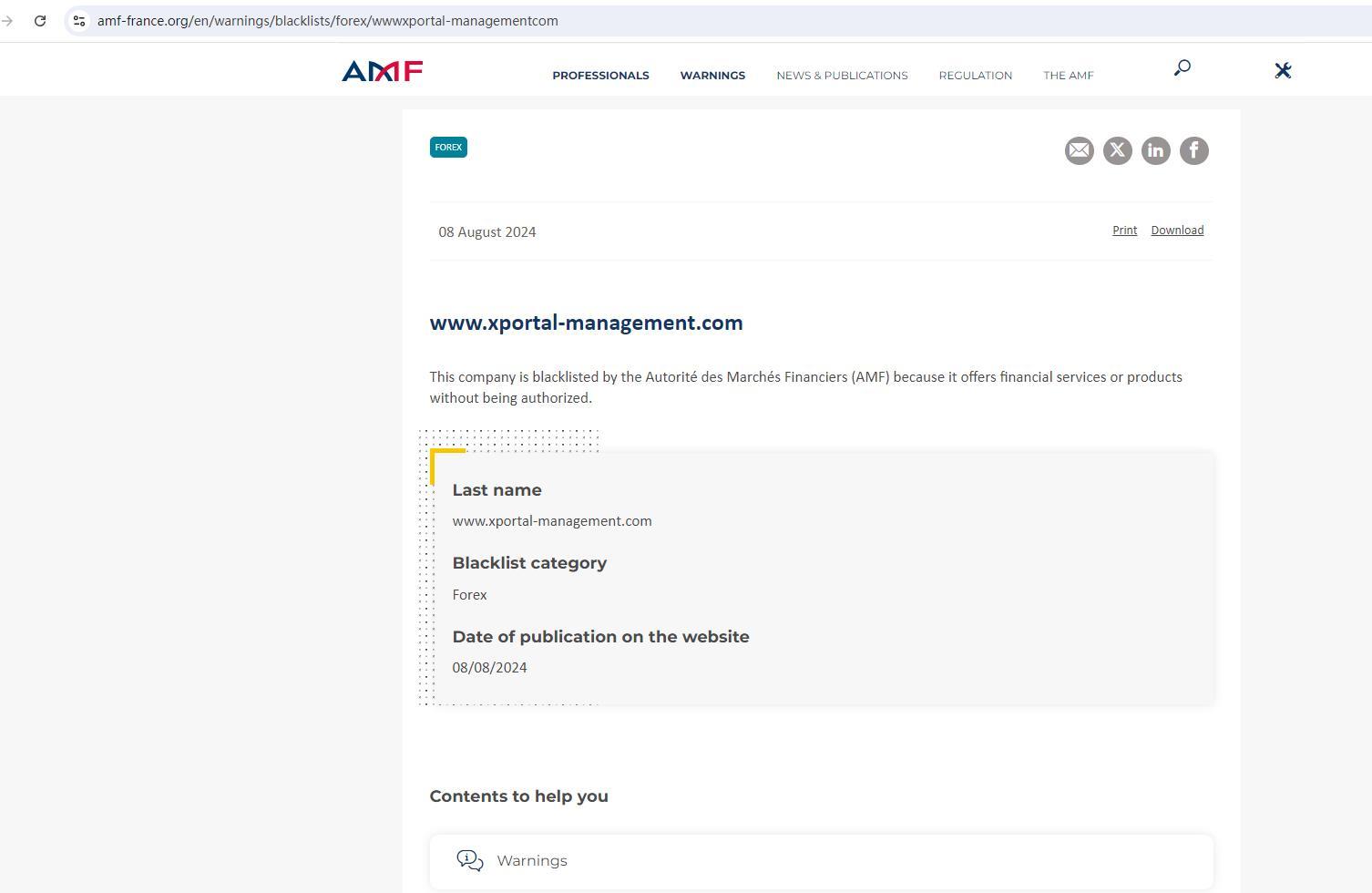 www. xPortal -management.com công ty này bị autorité des marchés financiers (amf) đưa vào danh sách đen vì cung cấp các dịch vụ hoặc sản phẩm tài chính mà không được cấp phép. họ www. xPortal -management.com blacklist category forex ngày công bố trên website 08/08/2024