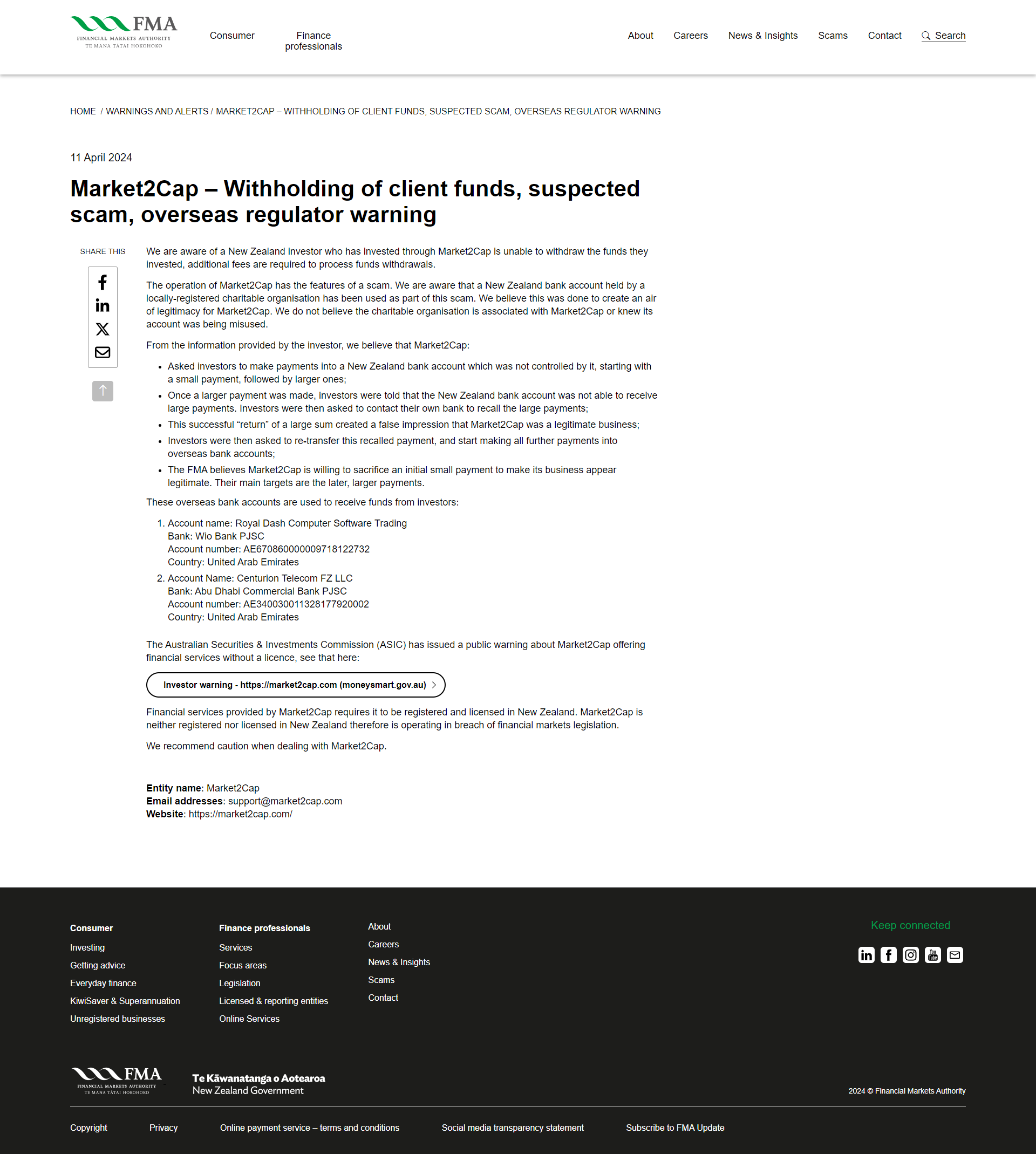 Market2cap– giữ lại tiền của khách hàng, nghi ngờ lừa đảo, cảnh báo của cơ quan quản lý nước ngoài