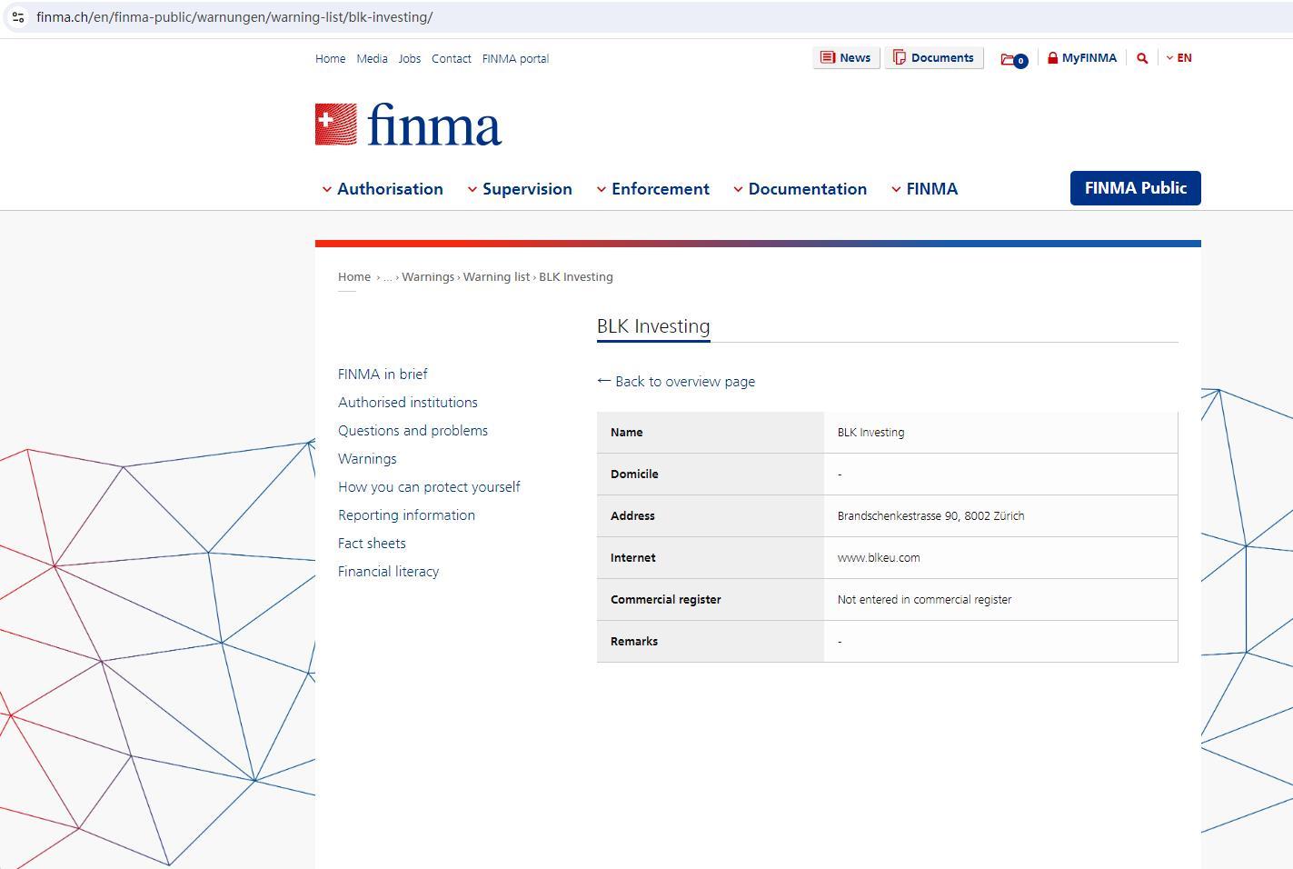 Tên BLK Investing Nơi cư trú - Địa chỉ Brandschenkestrasse 90, 8002 Zürich Internet www.blkeu.com Sổ đăng ký thương mại Không được ghi vào sổ đăng ký thương mại Ghi chú