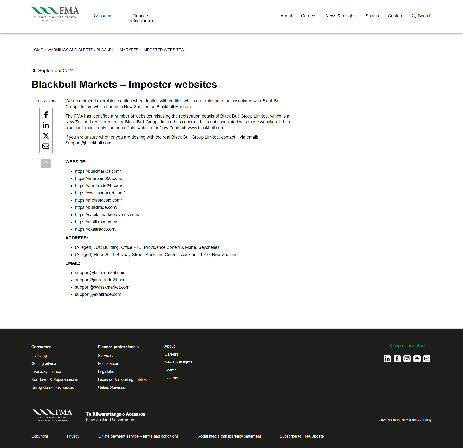• Lý do bị phạt FMA đã xác định một số trang web sử dụng sai thông tin đăng ký của Black Bull Group Limited, một thực thể đã đăng ký tại New Zealand. Black Bull Group Limited đã xác nhận rằng họ không liên kết với các trang web này. Họ cũng xác nhận rằng họ chỉ có một trang web chính thức cho New Zealand: www.blackbull.com
