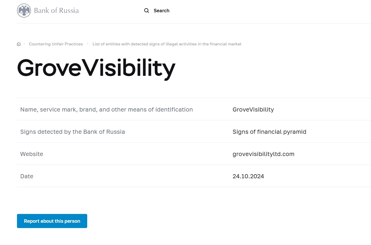 tên, nhãn hiệu dịch vụ, thương hiệu và các phương tiện nhận dạng khác GroveVisibility dấu hiệu phát hiện bởi ngân hàng nga dấu hiệu của trang web kim tự tháp tài chính GroveVisibility ltd.com ngày 24.10.2024