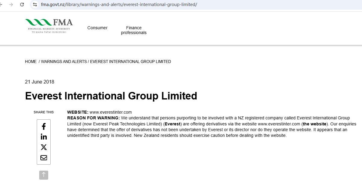 21 tháng 6 năm 2018 EVEREST INTERNATIONAL GROUP LIMITED chia sẻ trang web này: www. EVEREST lý do cảnh báo của inter.com: chúng tôi hiểu rằng những người tự nhận là có liên quan đến một công ty đã đăng ký tại New Zealand được gọi là EVEREST INTERNATIONAL GROUP LIMITED (Hiện nay EVEREST công nghệ đỉnh cao giới hạn) ( EVEREST ) đang cung cấp các sản phẩm phái sinh thông qua trang web www. EVEREST inter.com (trang web). các cuộc điều tra của chúng tôi đã xác định rằng việc cung cấp các sản phẩm phái sinh chưa được thực hiện bởi EVEREST hoặc giám đốc của trang web cũng không điều hành trang web. Có vẻ như có một bên thứ ba không xác định có liên quan. Người dân New Zealand nên thận trọng trước khi giao dịch với trang web.