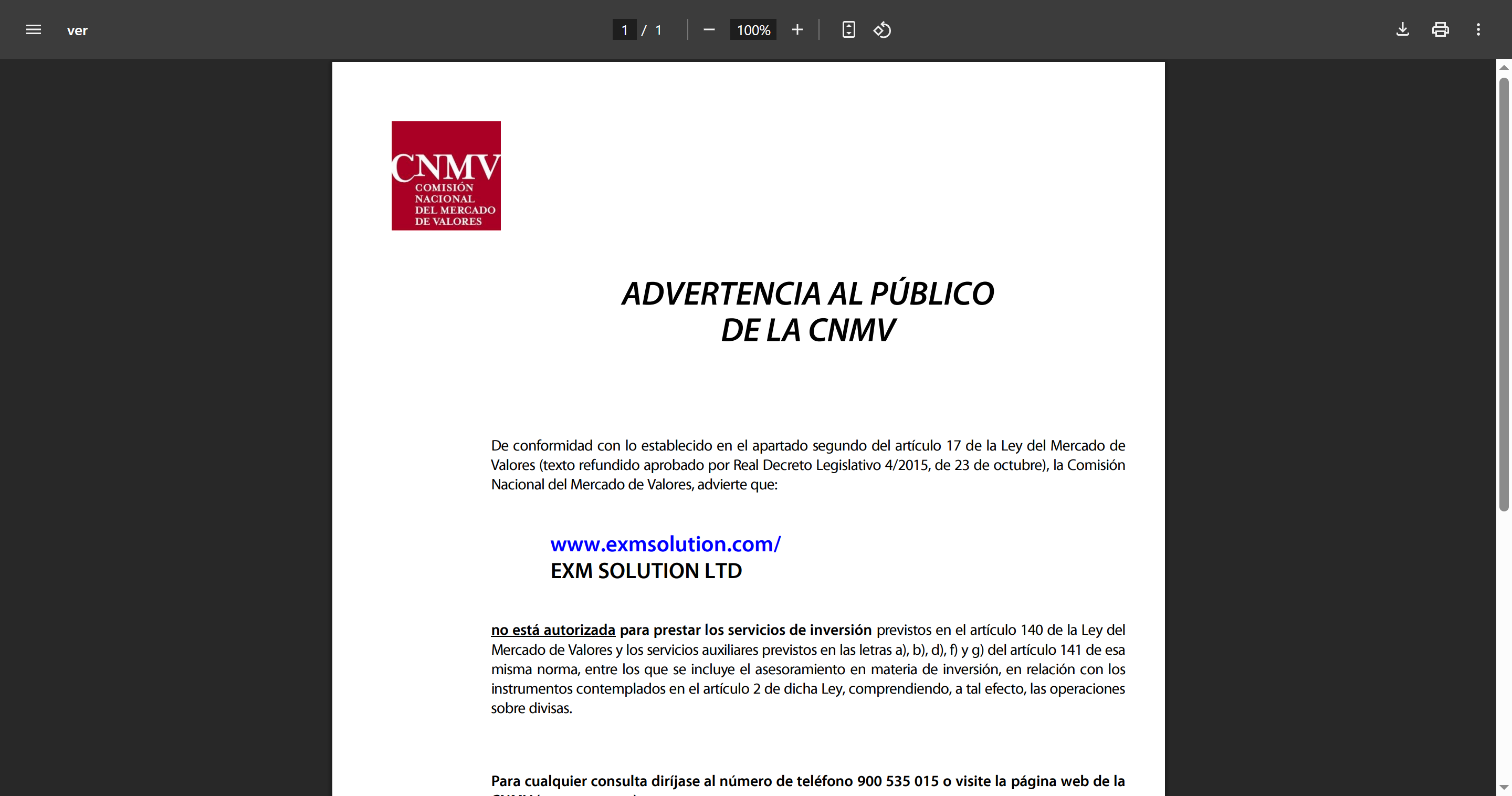 Thông báo công khai từ CNMV theo quy định của phần thứ hai của điều 17 của Luật thị trường chứng khoán (văn bản hợp nhất được phê duyệt bởi Nghị định lập pháp Hoàng gia 4/2015, ngày 23 tháng 10), Ủy ban thị trường chứng khoán quốc gia cảnh báo rằng: www.exmsolution.com/ EXM Solution Ltd Không được phép cung cấp các dịch vụ đầu tư theo quy định tại Điều 140 của Luật Thị trường Chứng khoán và các dịch vụ phụ trợ theo quy định tại các điểm a), b), d), f) và g) của Điều 141 của luật đó, bao gồm tư vấn đầu tư, liên quan đến các công cụ được quy định tại Điều 2 của luật đó, bao gồm cả giao dịch tiền tệ. Nếu có bất kỳ thắc mắc nào, vui lòng gọi 900 535 015 hoặc truy cập trang web CNMV (www.cnmv.es) ngày 27 tháng 7 năm 2020