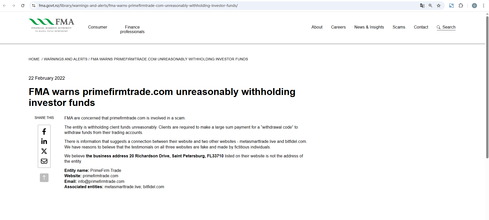fma cảnh báo PrimeFirmTrade .com giữ lại tiền của nhà đầu tư một cách vô lý