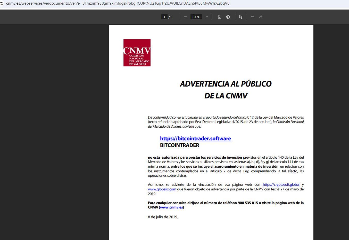 CẢNH BÁO CÔNG CHÚNG TỪ ỦY BAN CHỨNG KHOÁN QUỐC GIA TÂY BAN NHA (CNMV) Theo quy định tại khoản 2 Điều 17 Luật Thị trường Chứng khoán (bản hợp nhất được phê duyệt bởi Nghị định Hoàng gia 4/2015 ngày 23 tháng 10), Ủy ban Quốc gia về Thị trường Chứng khoán cảnh báo rằng: https://bitcointrader.software BITCOINTRADER không được cấp phép để cung cấp các dịch vụ đầu tư theo quy định tại Điều 140 Luật Thị trường Chứng khoán và các dịch vụ hỗ trợ theo điểm a), b), d), f) và g) Điều 141 của luật này, bao gồm tư vấn đầu tư liên quan đến các công cụ được đề cập tại Điều 2 của luật, trong đó có giao dịch ngoại hối. Đồng thời, CNMV cũng cảnh báo về mối liên hệ của trang web này với https://cryptosoft.global và www.globalix.com - những đối tượng đã bị CNMV cảnh báo vào ngày 27 tháng 5 năm 2019. Để được giải đáp thắc mắc, vui lòng liên hệ số điện thoại 900 535 015 hoặc truy cập trang web của CNMV (www.cnmv.es) Ngày 8 tháng 7 năm 2019..