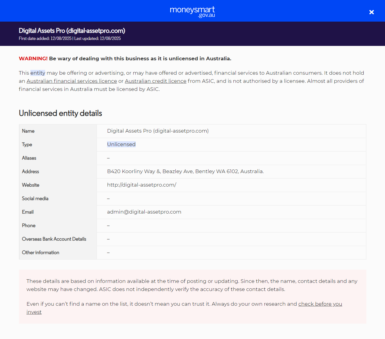 TênTài sản kỹ thuật số Pro (digital-assetpro.com) LoạiKhông được cấp phépCung cấp dịch vụ tài chính (bao gồm các sản phẩm tài chính) cho người dân tại Úc mà không có giấy phép. Họ không sở hữu giấy phép dịch vụ tài chính Úc (AFS) hoặc giấy phép tín dụng Úc từ ASIC. Bí danh– Địa chỉB420 Koorliny Way &, Beazley Ave, Bentley WA 6102, Australia. Trang webhttp://digital-assetpro.com/ Mạng xã hội– Emailadmin@digital-assetpro.com Điện thoại– Chi tiết tài khoản ngân hàng nước ngoài– Thông tin khác–.