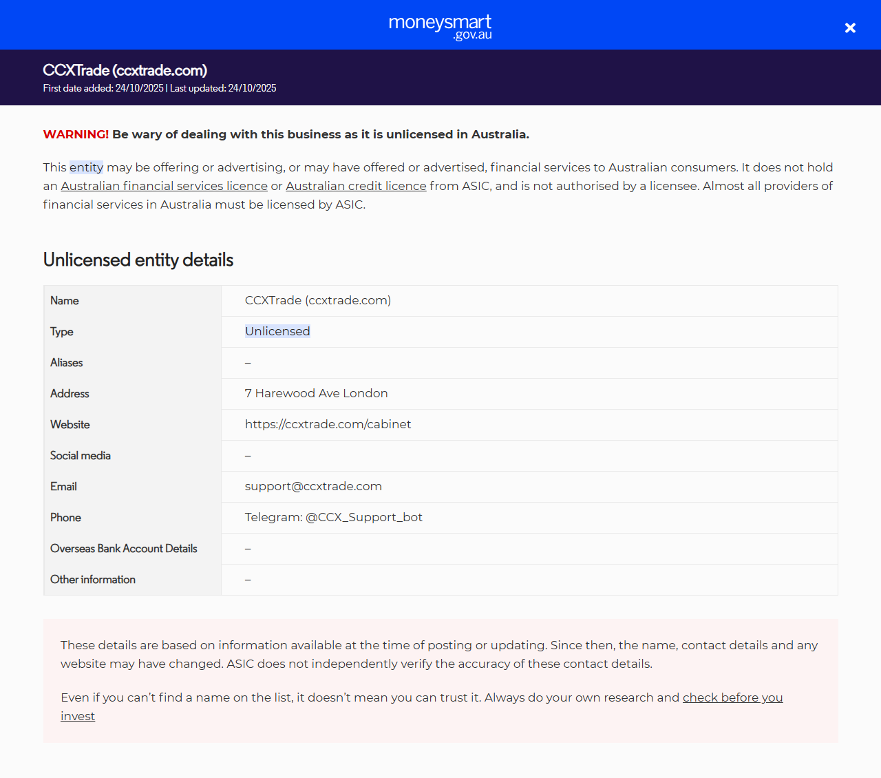 Tên CCX Trade (ccxtrade.com) Loại Cung cấp dịch vụ tài chính (bao gồm sản phẩm tài chính) cho người dân tại Úc mà không có giấy phép. Họ không có giấy phép dịch vụ tài chính Úc (AFS) hoặc giấy phép tín dụng Úc từ ASIC. Bí danh– Địa chỉ 7 Harewood Ave London Trang web https://ccxtrade.com/cabinet Mạng xã hội– Email support@ccxtrade.com Điện thoại Telegram: @CCX_Support_bot Chi tiết tài khoản ngân hàng nước ngoài– Thông tin khác–.