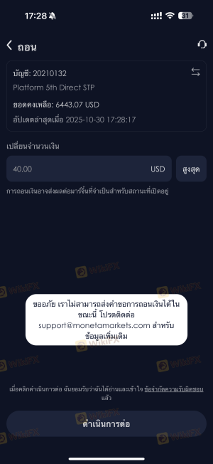 ได้เอาเงินเข้าฝากไป 2000$ แล้วก็เทรดจนได้กำไรมาประมาณ 4574$ แต่พอเข้าไปดูที่ช่องฝากและถอนเงินกลับขึ้นว่าบัญชีถูกจำกัดในวันที่เทรดได้ เลยได้แจ้งไปที่แอดมินและเมลของทีม moneta จนผ่านไปประมาณ 1 สัปดาห์ถูกห้ามเข้าแอคเคาท์ บอกว่าจะตรวจสอบอย่างละเอียด หลังจากนั้นตามไปเรื่อยๆ จนครบ 2 สัปดาห์ พอเข้าแอคเคาท์ได้แล้วแต่ตัวยอดกำไรหายหมด เหลือแต่ทุนที่ฝากเข้าไปเท่านั้น ซึ่งแบบนี้ไม่โอเคเลย โดยการเทรดที่เขาสงสัยก็เป็นการ pending order buy stop กับ sell stop ไว้เท่านั้น เขายังส่งเมลล์มาแย้งว่าเกิดจากการเปิดออเดอร์พร้อมกันแบบ hedging พอร์ต ซึ่งไม่ตรงกับสิ่งที่เกิดขึ้น จนมาตอนท้ายบอกใช้เลเวอเรจสูงเกินไปในช่วงมีข่าว ซึ่งถ้าเป็นอย่างนั้นโบรคเกอร์ควรปรับ leverage ให้ลดลงในช่วงมีข่าวหรืออะไรต่างๆ เองไม่ใช่ลูกค้าเทรดแล้วได้กำไรแล้ว มาบอกทีหลังแบบนี้ ทั้งๆที่ทุกอย่างมันมีให้ใช้ปกติเลย ทั้ง leverage ทั้ง pending order เสียเวลาและความรู้สึกมากๆครับ (มีวีดีโอตอนเทรดอยู่แต่ไม่สามารถลงพร้อมกันกับรูปได้มาขอเพิ่มเติมได้ครับ)
