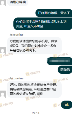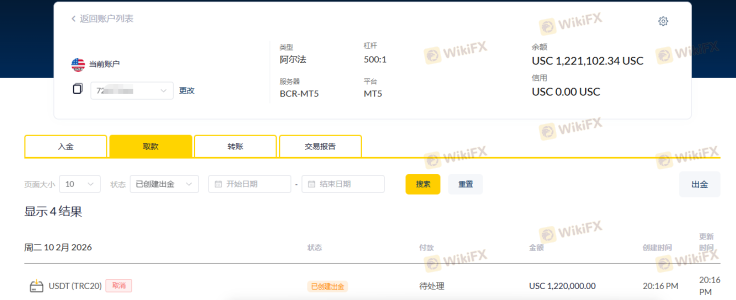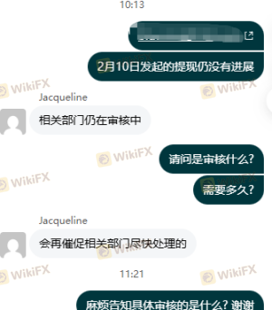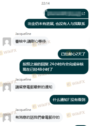 2月10日20:16发起出金, 宣称2小时内U到账,至今仍未到账. 昨日询问客服反馈24小时完成审核, 截止目前已超48小时仍未完成审核. 今日中午询问进度, 反馈会有客户经理联系,目前没有任何人与我沟通. 刚刚再次询问又让我等邮件通知, 没有诚信.