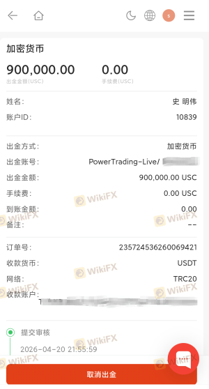 我从二月份就开始申请出金,这已经是我第n次申请出金了,最后平台索性就不受理了,一直处于审核中,,平台无缘无故就不给出金,希望各位投资者可以擦亮双眼,不要选择不靠谱的小平台,尤其是这个平台,Power Trading,一定不要在这个平台交易!!!