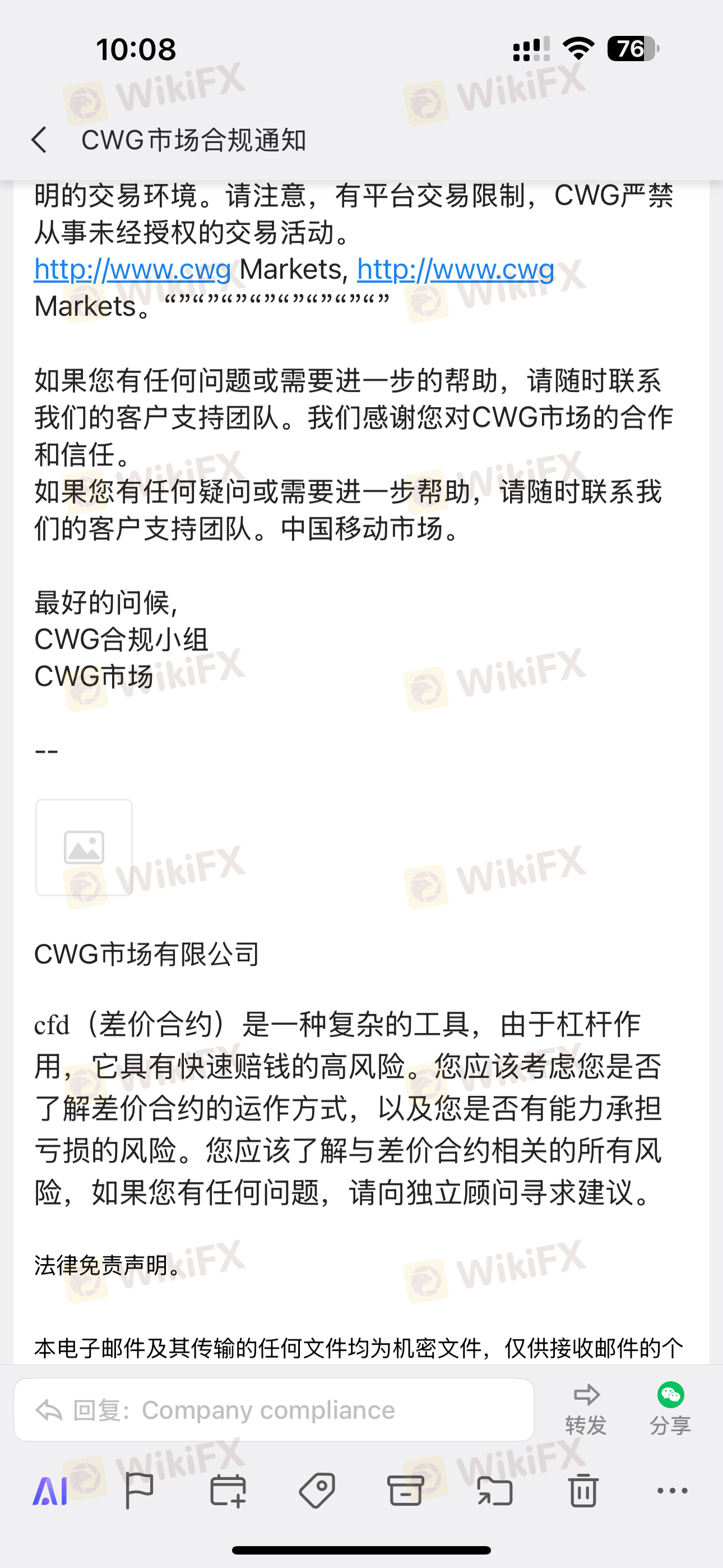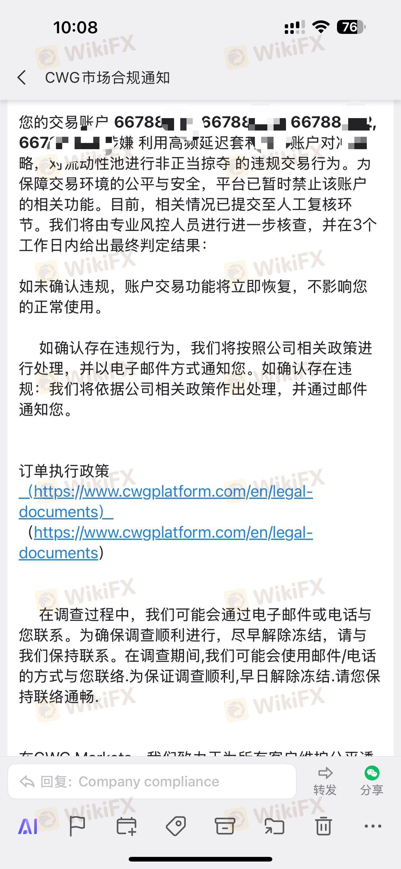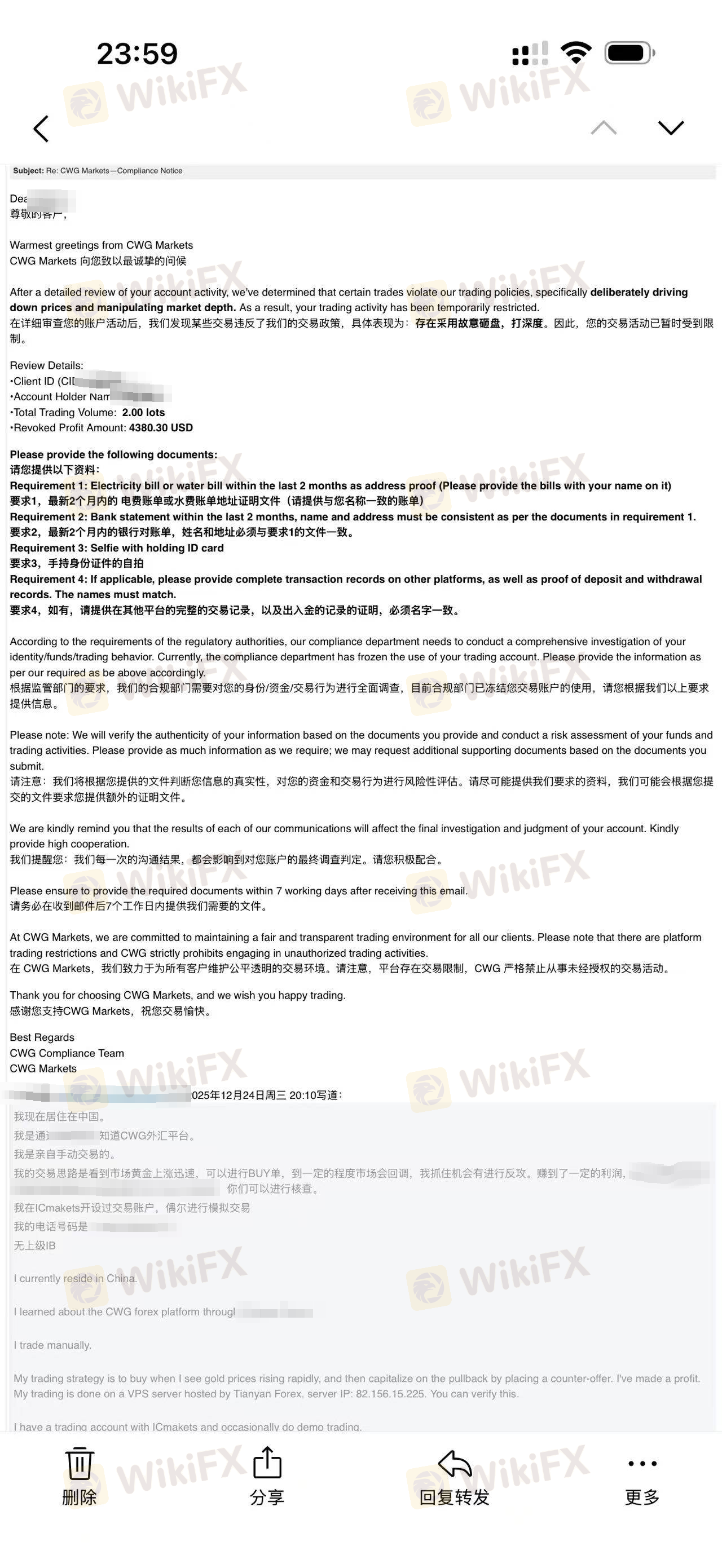 Sau khi gửi 100.000 đô la vào ngày 21/6, tôi bắt đầu giao dịch. Không có vấn đề gì khi rút lợi nhuận cho đến khi tôi yêu cầu rút tiền vào ngày 31/7. Khi tôi gọi cho nhân viên liên quan, họ luôn tìm cách bào chữa. Cho đến ngày 23/9, phòng giao dịch của CWG gửi một lá thư cho biết tôi đã tham gia "giao dịch không đều" mà không có bất kỳ bằng chứng nào, và sau đó họ không lý do mà đã loại bỏ số tiền 34.579,43 đô la khỏi tài khoản MT4 của tôi. Tôi đã giao dịch ngoại hối ký quỹ trong một thời gian dài, và đây là lần đầu tiên tôi gặp phải một nền tảng có thể lấy đi số tiền của bạn chỉ với một cáo buộc "giao dịch không đều". Vì quá trình xử lý thư khiếu nại của tôi tại Vương quốc Anh mất 8 tuần, tôi muốn nhắc nhở khách hàng của CWG ở đây hãy cẩn thận hơn với nền tảng này. Hãy cực kỳ thận trọng. PS: Những bức ảnh tôi cung cấp là ảnh chụp màn hình từ bên trong của tôi. Tôi đã làm mờ tên và thông tin của mình để tránh sự trả thù từ nền tảng và đã xóa tất cả thông tin khác của tôi.