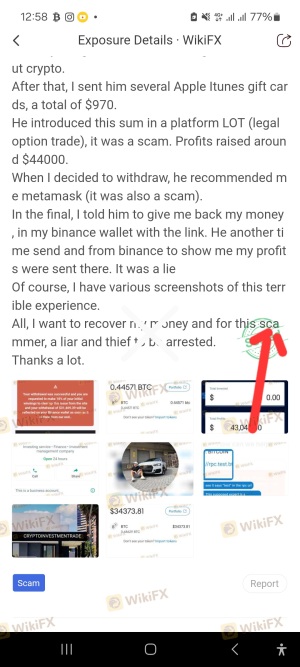 Tôi đến từ vùng Sahara ở Bắc Phi. Vào mùa hè năm ngoái (2023), một chuyên gia giao dịch ngoại hối Mỹ đã liên lạc với tôi qua Instagram và chúng tôi đã trao đổi về tiền điện tử trực tuyến. Sau đó, tôi đã gửi cho anh ta một số thẻ quà tặng Apple iTunes, tổng cộng 970 đô la. Anh ta đã đưa số tiền này vào một nền tảng gọi là LOT (giao dịch quyền chọn hợp pháp), đó là một trò lừa đảo. Lợi nhuận tăng khoảng 44000 đô la. Khi tôi quyết định rút tiền, anh ta đã giới thiệu cho tôi metamask (cũng là một trò lừa đảo). Cuối cùng, tôi đã yêu cầu anh ta trả lại tiền cho tôi và đặt liên kết vào ví binance của tôi. Anh ta lại một lần nữa gửi liên kết từ binance cho tôi, nói rằng tiền của tôi đã được chuyển vào đó. Đây là một trò lừa đảo, tất nhiên, tôi có các ảnh chụp màn hình về trải nghiệm kinh hoàng này. Tôi muốn lấy lại tiền của mình, vui lòng bắt giữ kẻ lừa đảo này. Rất cảm ơn.