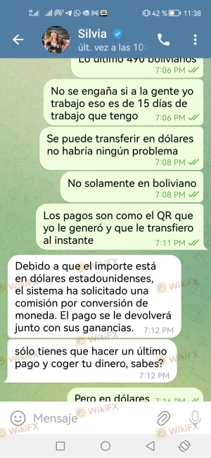 Người này yêu cầu tôi đầu tư vào nền tảng của cô ấy những gì có lợi, sau đó sau khi có lợi nhuận, cô ấy yêu cầu tôi phải đầu tư thêm tiền để có thể rút lợi nhuận mà tôi đã gửi tiền và cô ấy yêu cầu tôi một số tiền hoán đổi tiền tệ khác mà sàn giao dịch cần. Để có thể gửi tiền, tôi phải gửi một khoản tiền gửi là 1250 bolivianos để họ có thể gửi tiền cho tôi theo khi tôi gửi tiền lần đầu, họ nói với tôi rằng tôi có thể rút nó với số tiền là 710 bolivianos nhưng điều đó không xảy ra và sau đó họ yêu cầu tôi 1250 bolivianos và cho đến nay không có gì xảy ra.