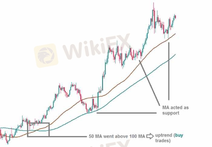 Khi đường MA ngắn hạn (ví dụ, có khoảng thời gian 50) nâng lên cao hơn đường MA dài hạn (ví dụ, có khoảng thời gian 100) thì chắc chắn xu hướng sẽ tăng giá. Và ngược lại, khi đường MA ngắn hạn rơi xuống dưới đường MA dài hạn thì xu hướng chắc chắn sẽ giảm giá.